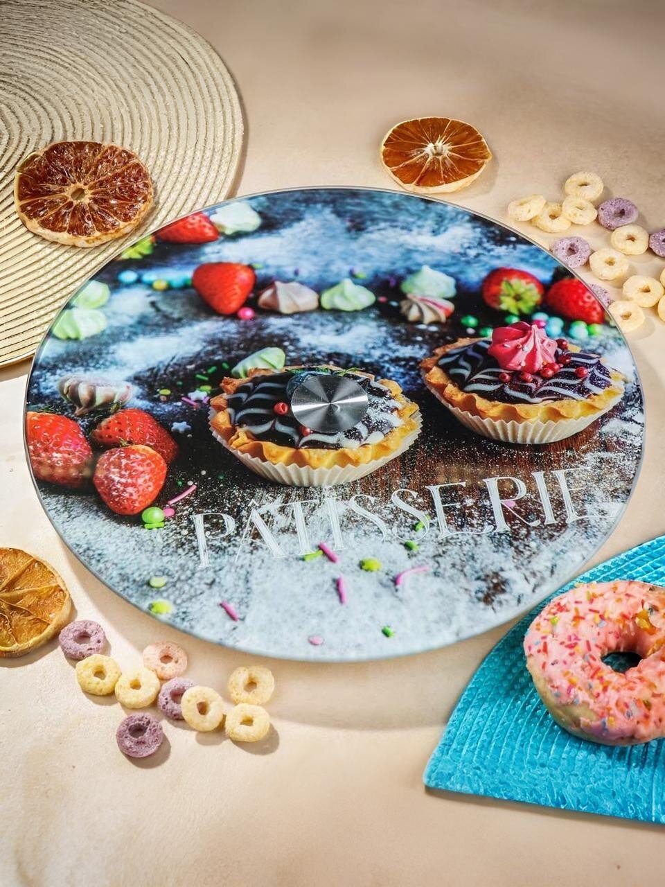 Вращающееся стеклянное блюдо Daniks «Пирожные» диаметром 30 см — идеальный выбор для сервировки тортов, пирожных, фруктов и закусок. Благодаря устойчивой ножке и плавному вращению, каждый гость легко сможет взять угощение, не нарушая композицию на столе. Цветной праздничный рисунок делает блюдо не только функциональным, но и стильным элементом декора для любого праздника.