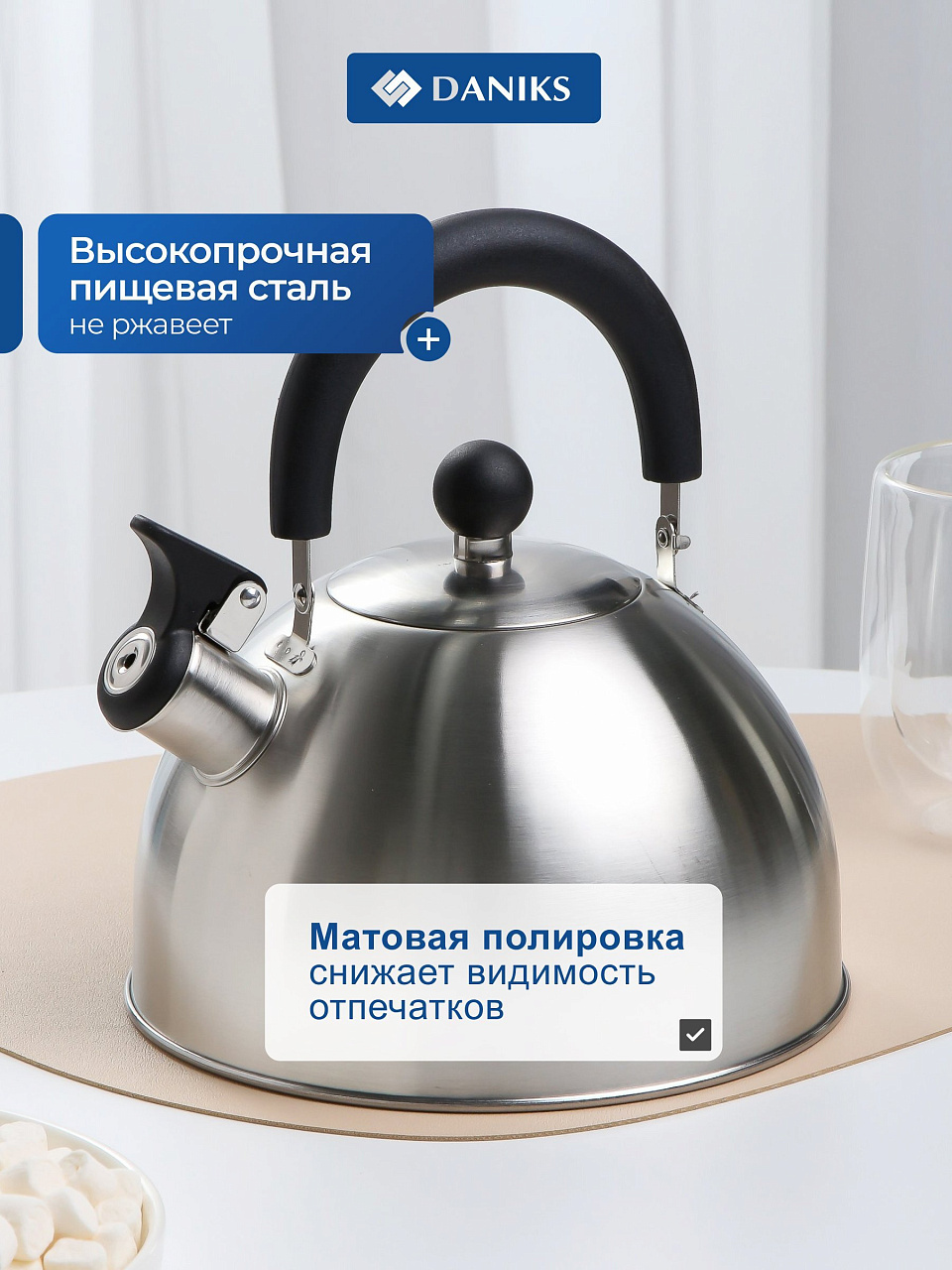Чайник Daniks 2.5 л из матовой нержавеющей стали со свистком — оптимальный выбор для дома и дачи: подходит для всех плит, не нагревает ручку, выгодная цена.