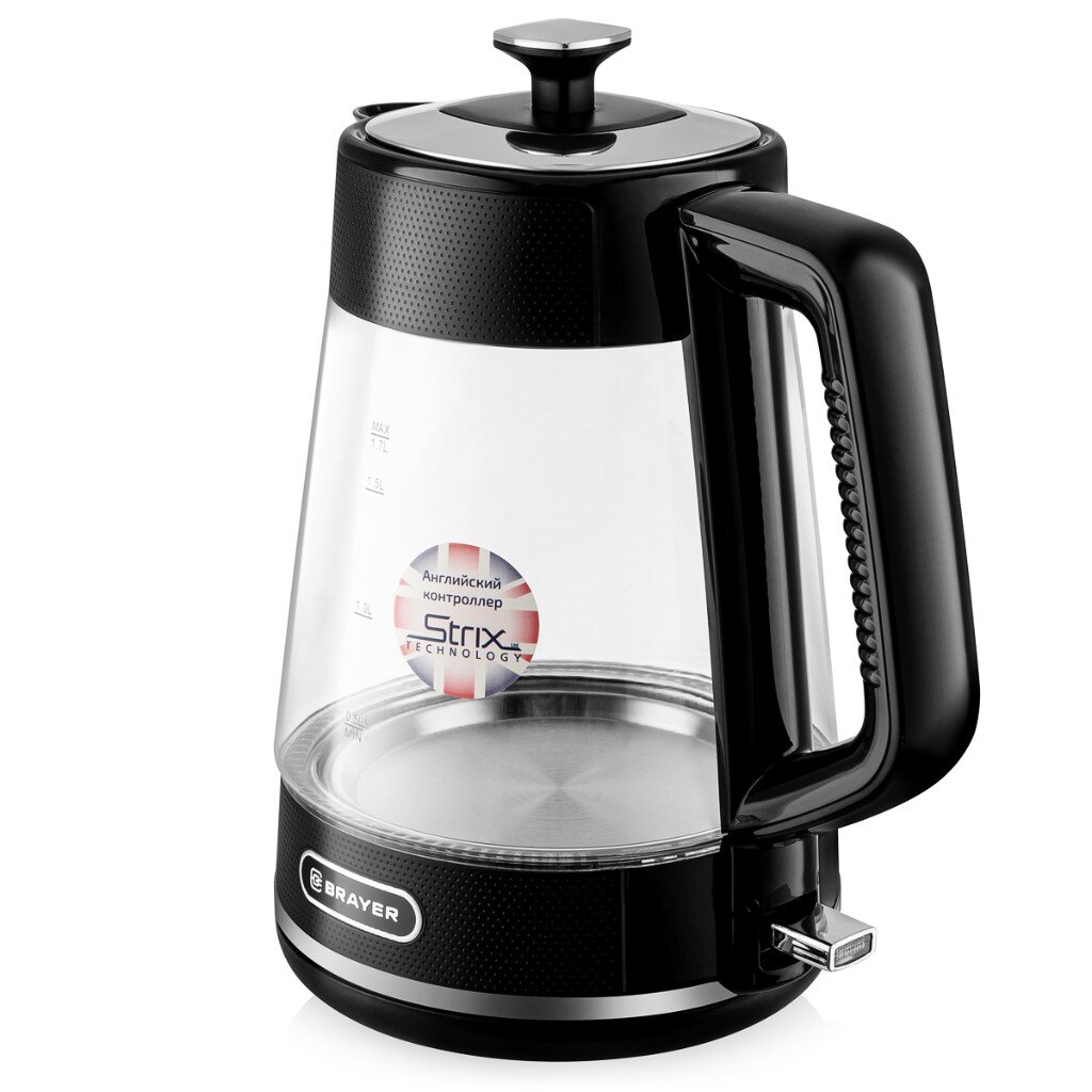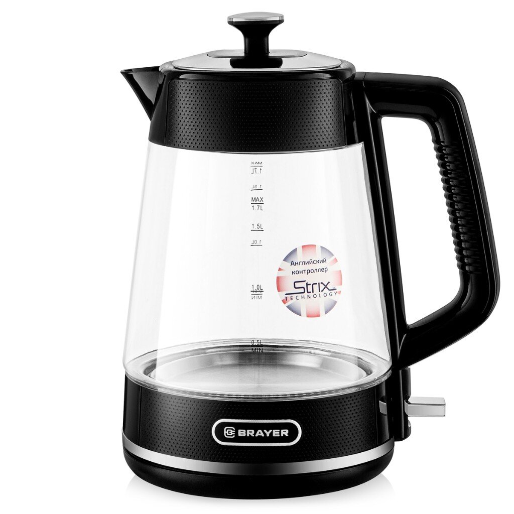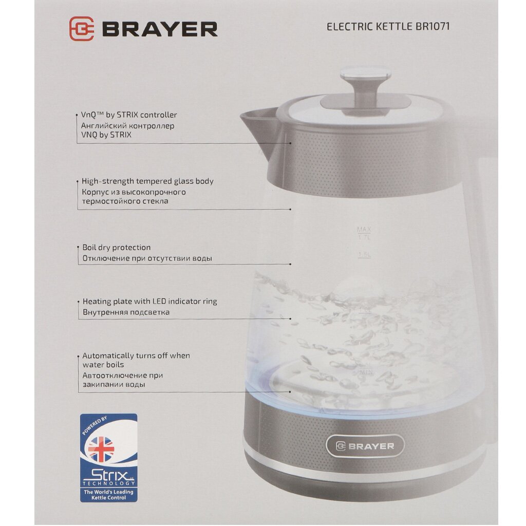 Современный электрический чайник BRAYER 1071BR Strix: быстрое кипячение 1.7 л воды, долговечное стекло, премиальный дизайн и надежная защита от накипи.