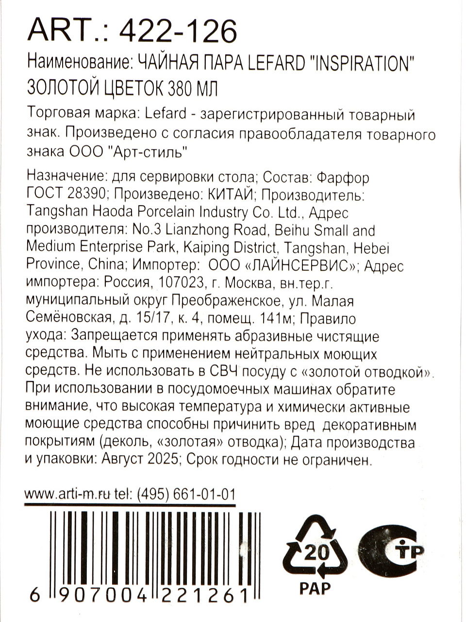 Чайная пара Lefard INSPIRATION Золотой цветок — это сочетание современного стиля и практичности. Фарфор премиального качества обеспечивает прочность и сохраняет вкус напитка, а объем чашки 380 мл подходит для чая, кофе или авторских напитков. Если вы ищете, какую чайную пару выбрать для подарка женщине или как выбрать фарфоровую чашку для ежедневного использования, обратите внимание на эту модель: она идет в подарочной упаковке и подчеркнет статус получателя.