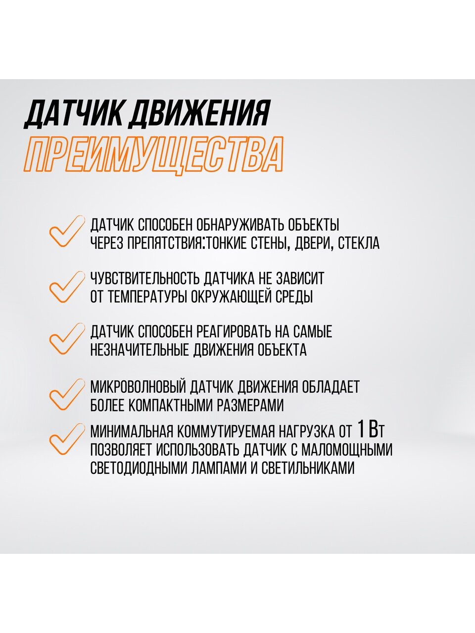 - Датчик способен обнаруживать объекты через препятствия: тонкие стены, двери, стекла и др. (в связи с этим возможно спрятать датчик под стеклом светильника, подвесным или натяжным потолком, установить внутри дома перед дверью для обнаружения объектов на улице),