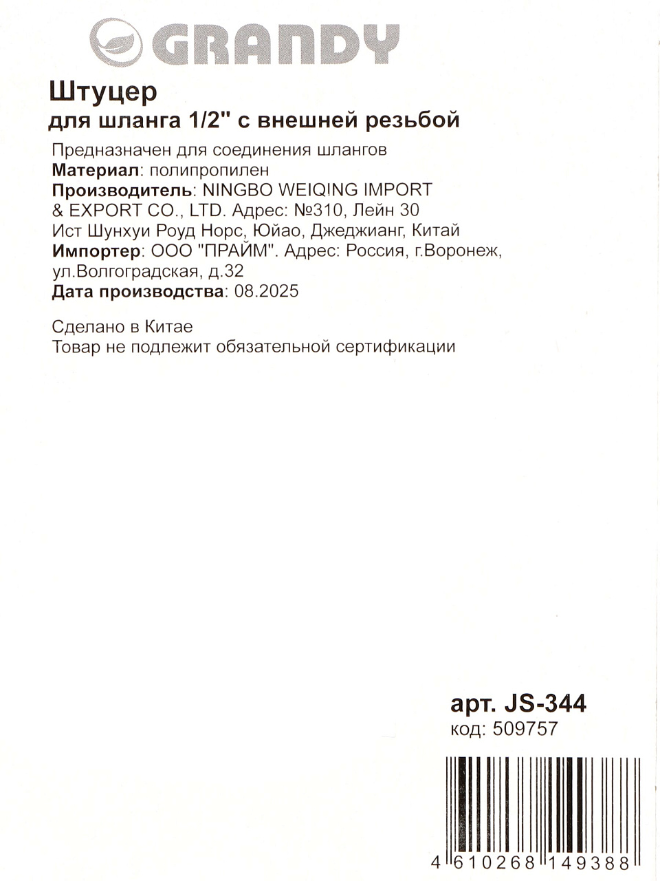 Штуцер для шланга 1/2, быстросъемный, внешняя резьба, пластик, Grandy, JS-344