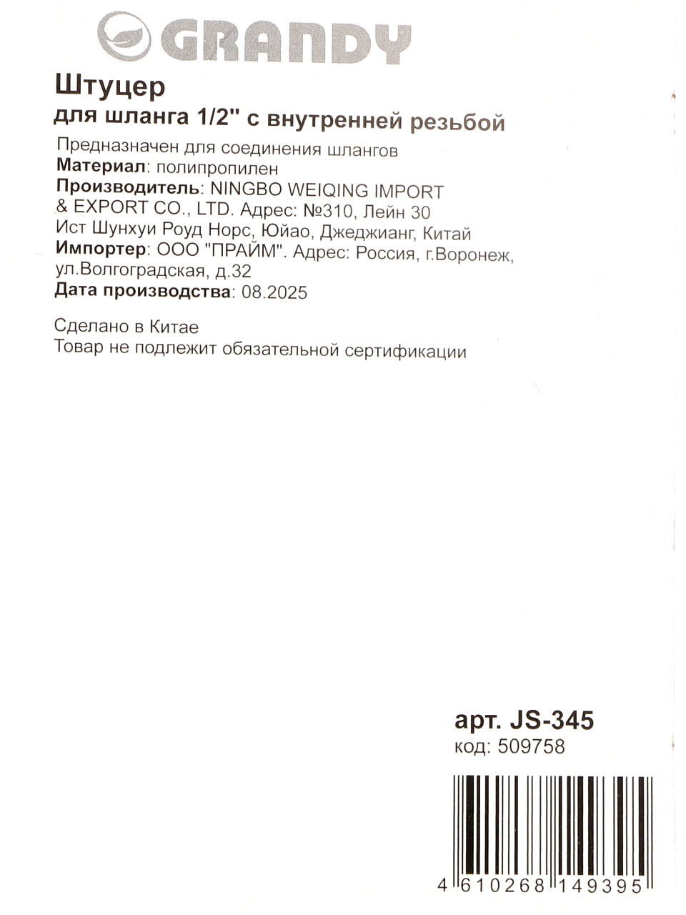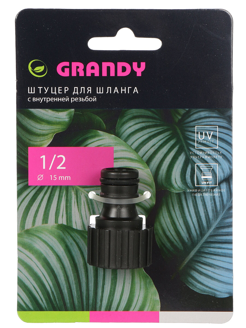 Штуцер для шланга 1/2, быстросъемный, внутренняя резьба, пластик, быстросъемный, Grandy, JS-345