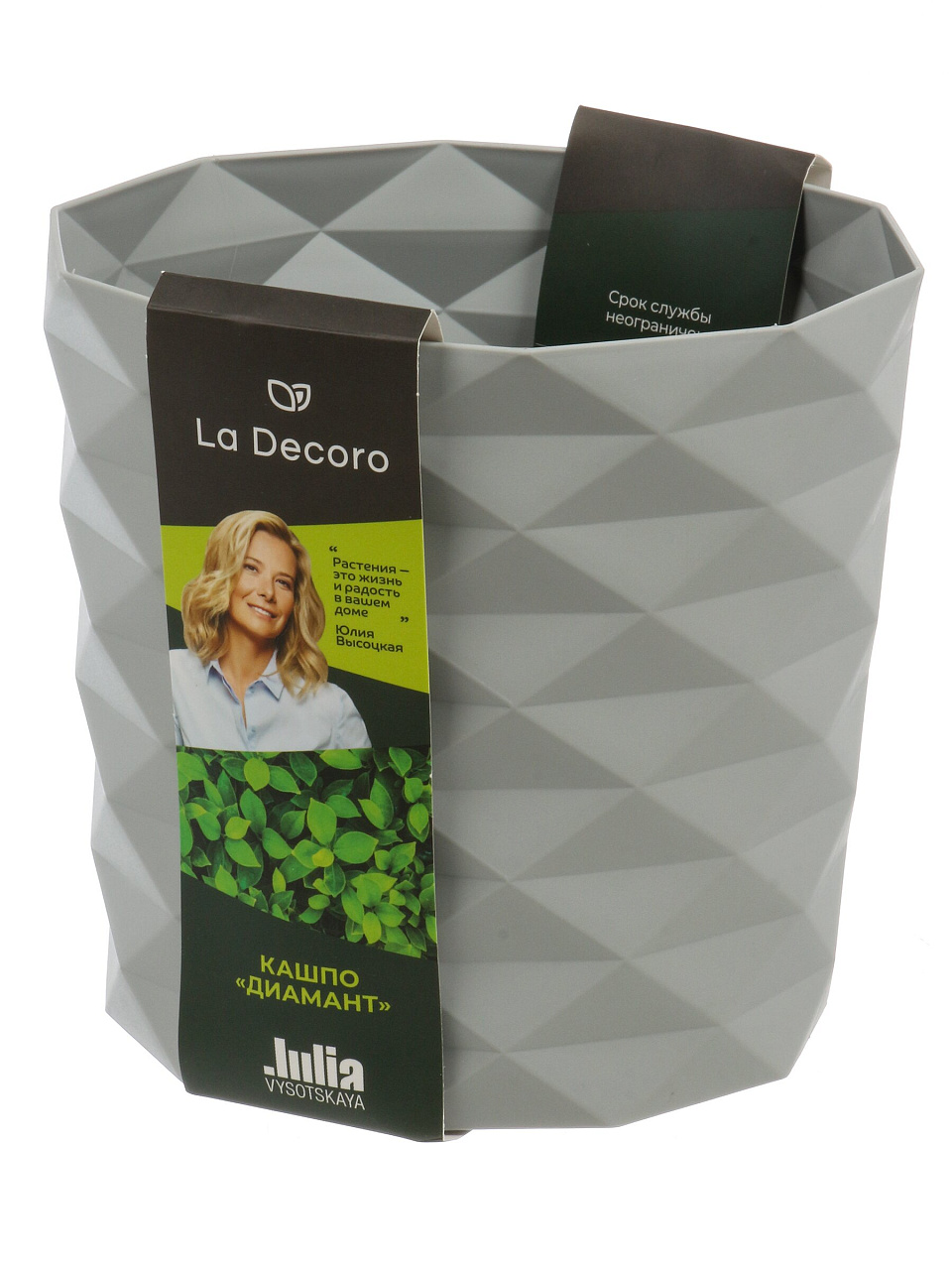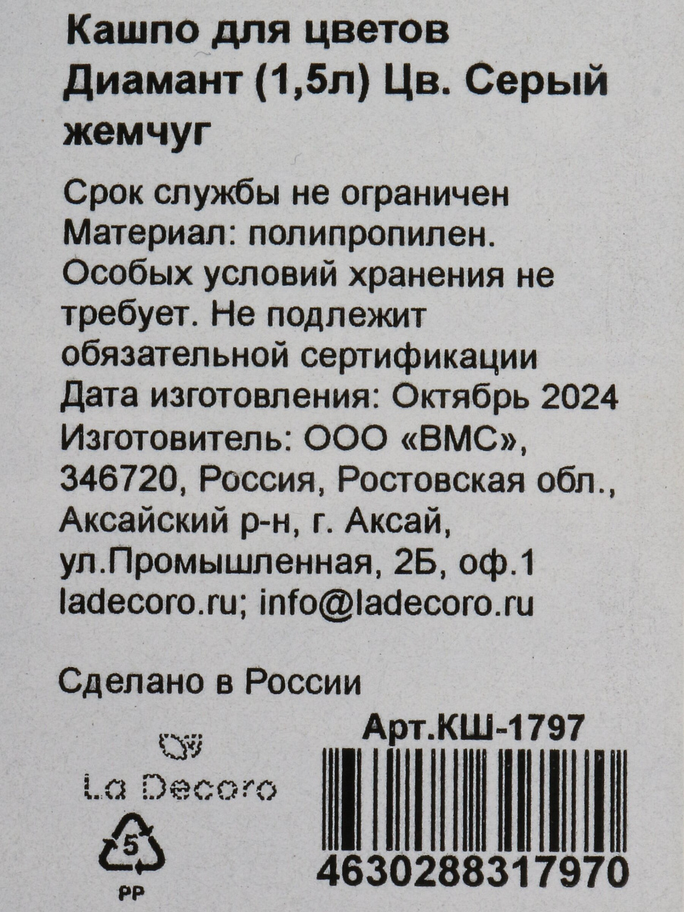 Кашпо La Decoro Диамант 1,5 л — стильное решение для комнатных растений: прочный пластик, современный серый жемчуг, компактно для стола или подоконника.