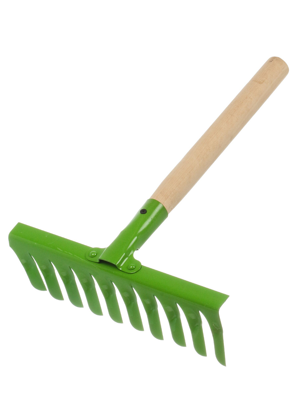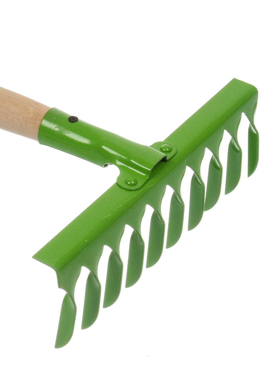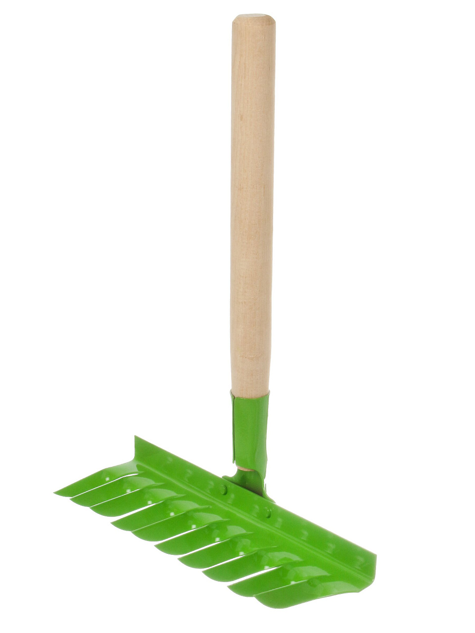 Витая форма зубцов эффективна для уборки мусора, рыхления и выравнивания земли. Клёпанная тулейка предотвращает расшатывание, а деревянный черенок приятен на ощупь и не скользит в руке.