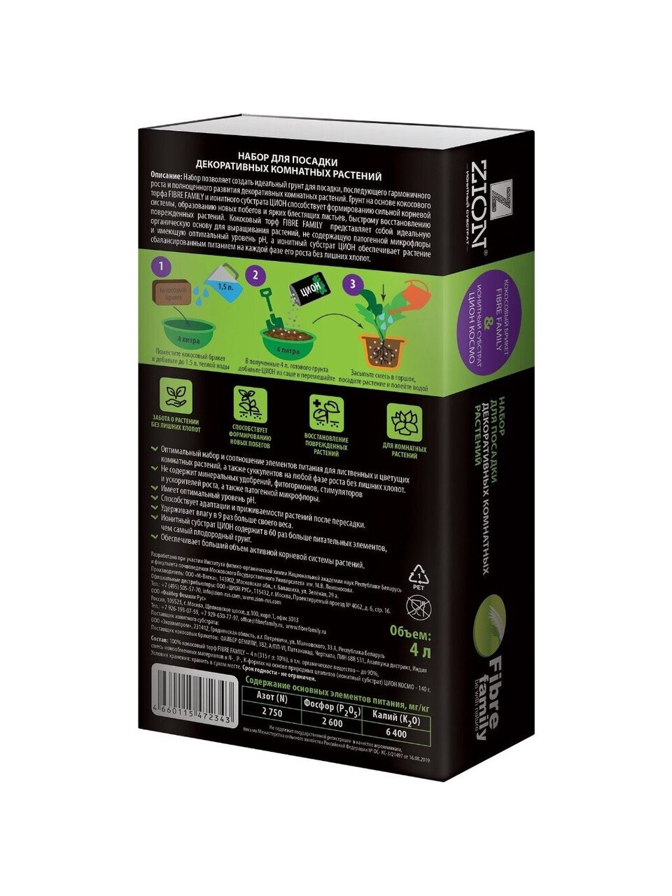 Набор позволяет создать идеальный грунт для посадки, последующего гармоничного роста и полноценного развития декоративных комнатных растений. Грунт на основе кокосового торфа Fiber family и ионитного субстрата ЦИОН способствует формированию сильной корневой системы, образованию новых побегов и ярких, блестящих листьев.