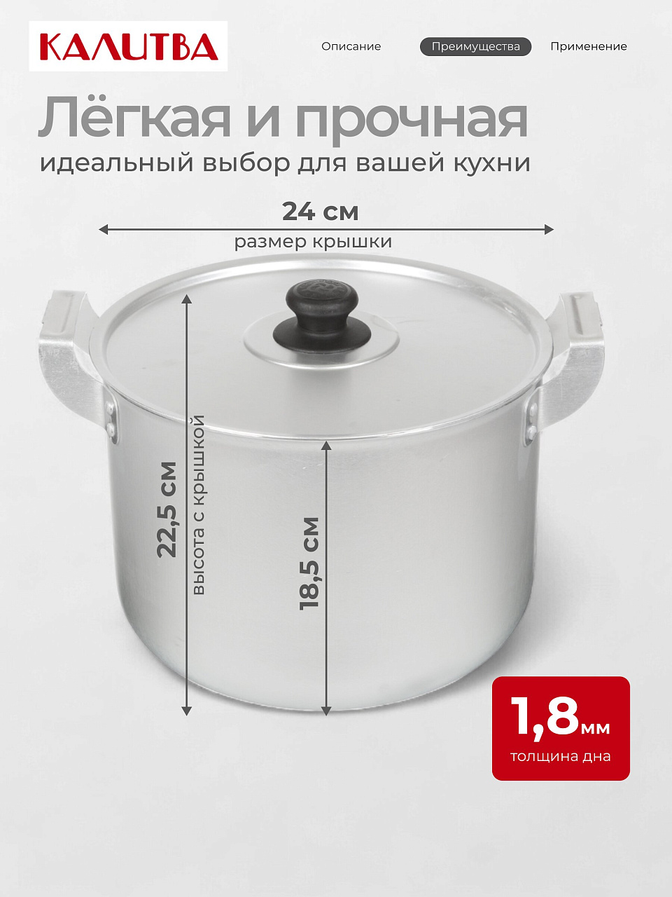 Диаметр дна и крышки — 24 см, высота с крышкой — 22,5 см, без крышки — 18,5 см, вес — 0,85 кг. Толщина дна — 1,8 мм.