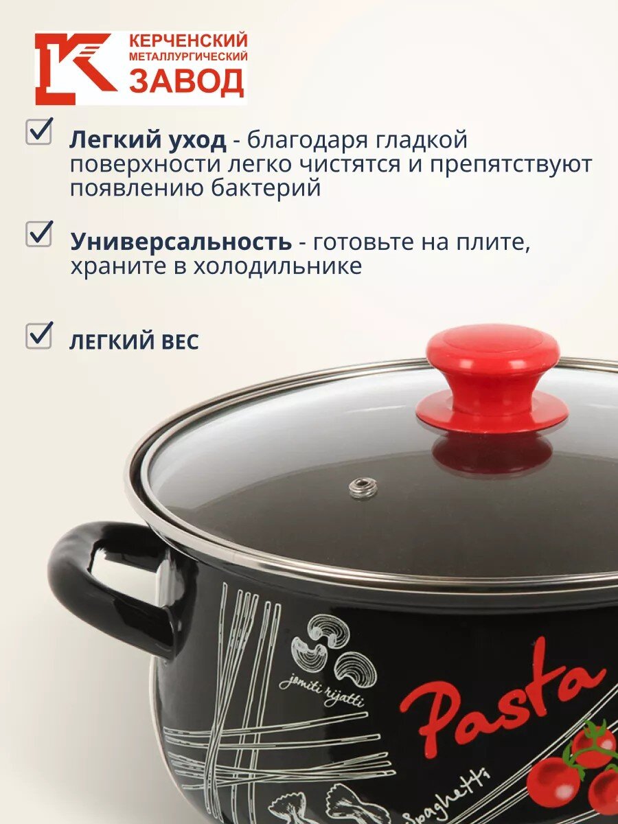 Кастрюля эмалированная сталь 3 л с крышкой из стекла — это современное решение для тех, кто ищет долговечную посуду без антипригарного покрытия. Благодаря сферической форме и однослойному дну тепло равномерно распределяется, что особенно важно при варке супов, каш и пельменей. Модель «Болоньезе» от Керченского металлургического завода отличается стильным черным декором, который украсит любую кухню и станет отличным подарком.