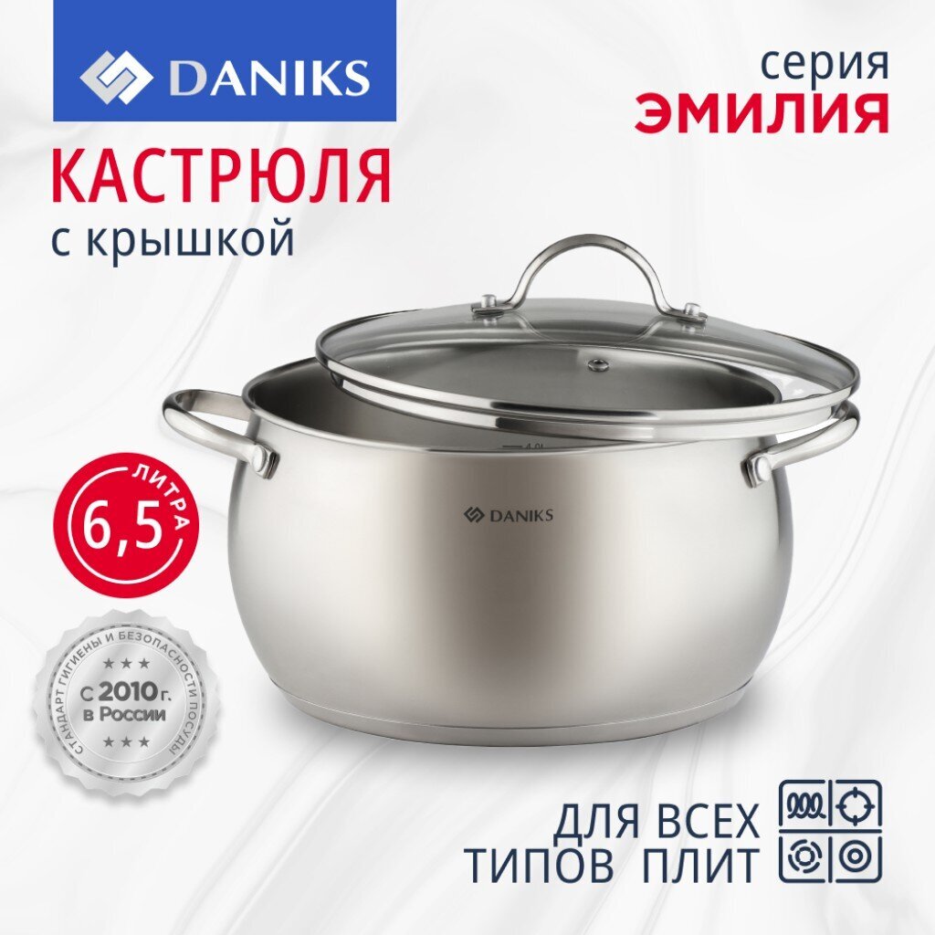 Кастрюля Daniks Эмилия 6.5 л из нержавеющей стали 304 с капсульным дном: оптимальный выбор для индукции, газовых и электрических плит. Прочная, вместительная, с мерной шкалой и стеклянной крышкой — для дома и дачи.