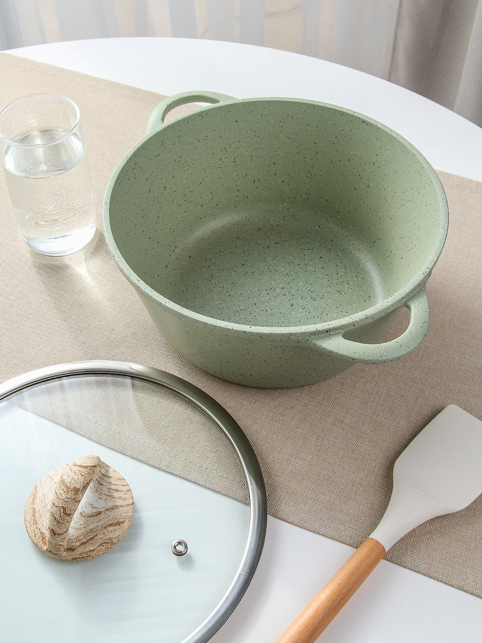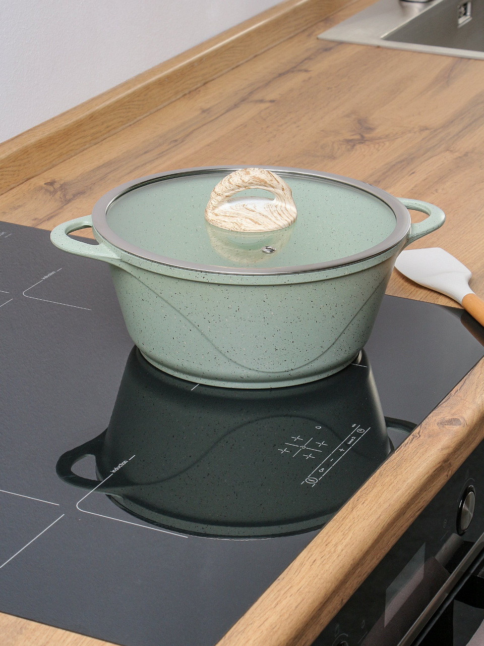 Кастрюля бренда Гурман мятного цвета станет отличным дополнением к любой кухне. Она подходит для варки, тушения и томления продуктов, благодаря чему получаются вкусные и сочные блюда. У кастрюли экологичное антипригарное покрытие нового поколения, которое делает процесс приготовления пищи максимально комфортным и безопасным.