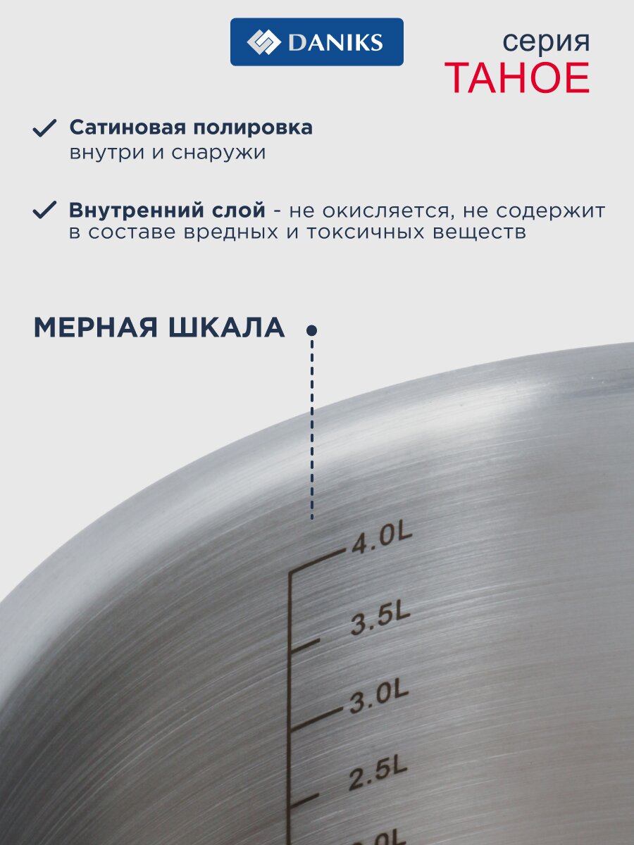 Кастрюля Daniks Тахо 4,75 л — это оптимальный выбор для тех, кто ищет универсальную посуду для разных блюд и плит. Благодаря прочной нержавеющей стали (марка 304) и капсульному дну, кастрюля быстро нагревается и долго удерживает тепло. Стеклянная крышка с выпускным клапаном позволяет контролировать процесс готовки, а мерная шкала внутри удобна для точного измерения объёма. Если вы ищете, какую кастрюлю выбрать для супа, борща или варенья, обратите внимание на этот вариант — он подходит для газовых, электрических, индукционных и стеклокерамических плит.