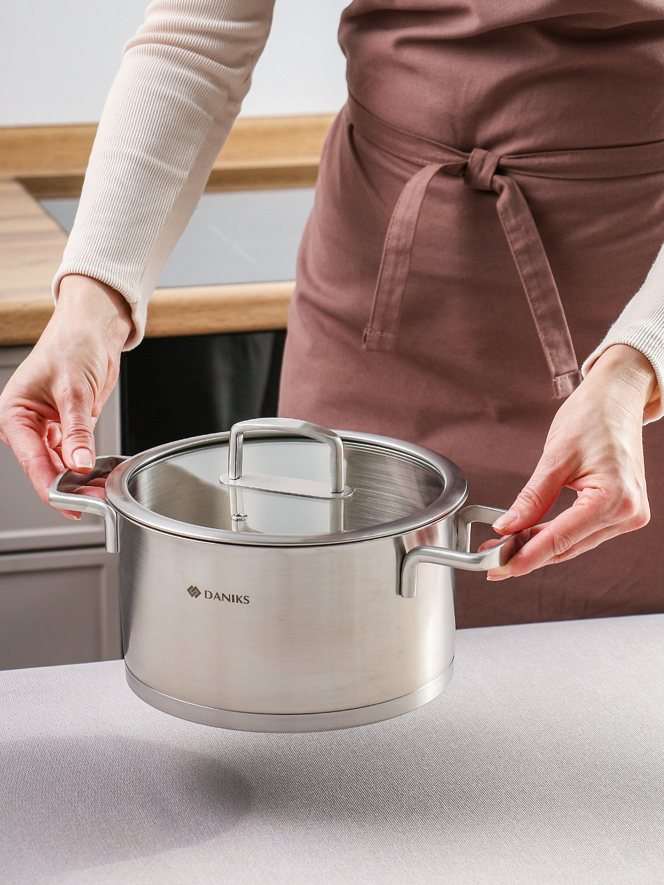 Кастрюля Daniks Тахо 4,75 л из нержавеющей стали с капсульным дном и стеклянной крышкой — универсальное решение для индукционных плит и активной кухни. Готовьте борщ, суп, варенье или компот легко и безопасно, экономя время и энергию.