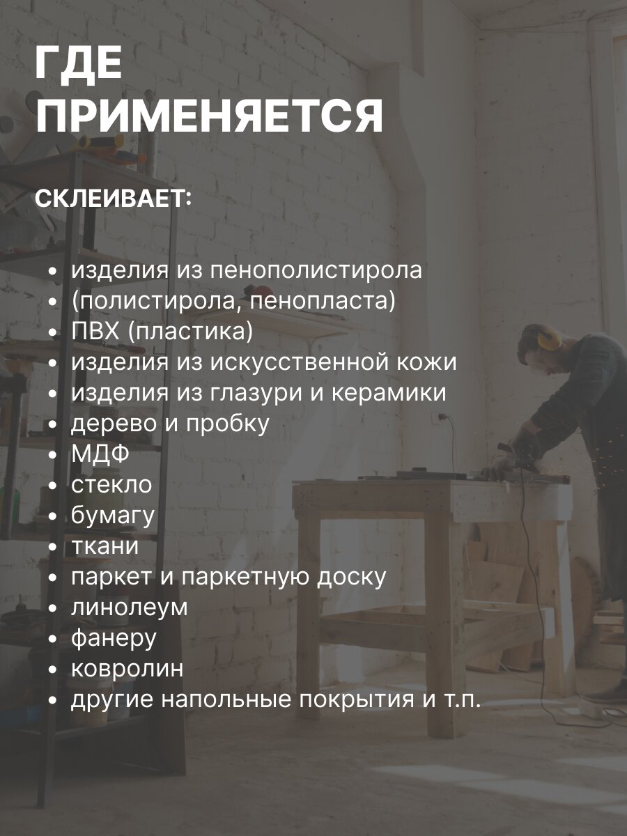 Универсальный полимерный клей. Предназначен для общестроительных и ремонтных работ. Область применения клея - широчайший спектр неинертных материалов. Применяется для склеивания в разных комбинациях, а также для приклеивания материалов к бетонным, цементно – известковым, гипсовым, штукатурным поверхностям.
