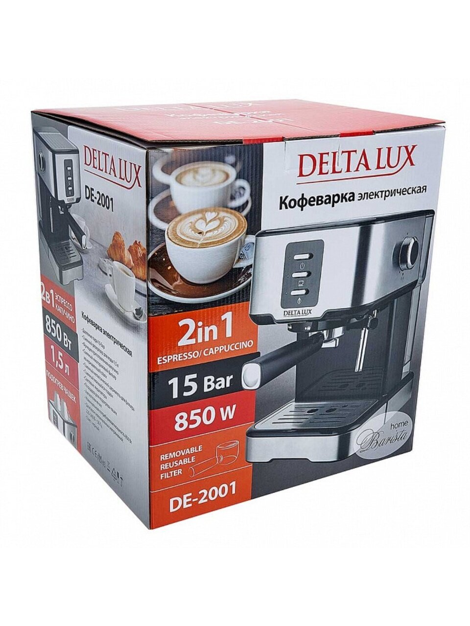 Вы можете приобрести «Кофеварка электрическая, рожковая, 1.5 л, Delta Lux, DE-2001, 850 Вт, 15 бар, капучино, эспрессо, черная» и другие товары в нашем интернет-магазине в Краснодаре по низким ценам и с бесплатным самовывозом.