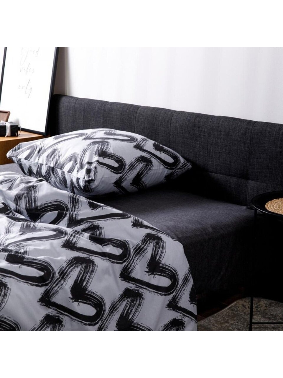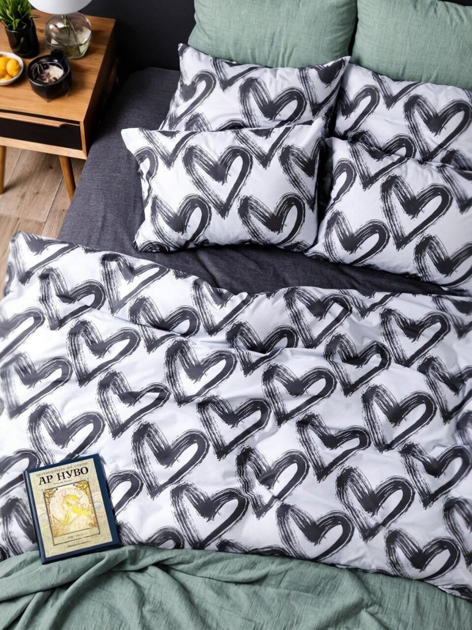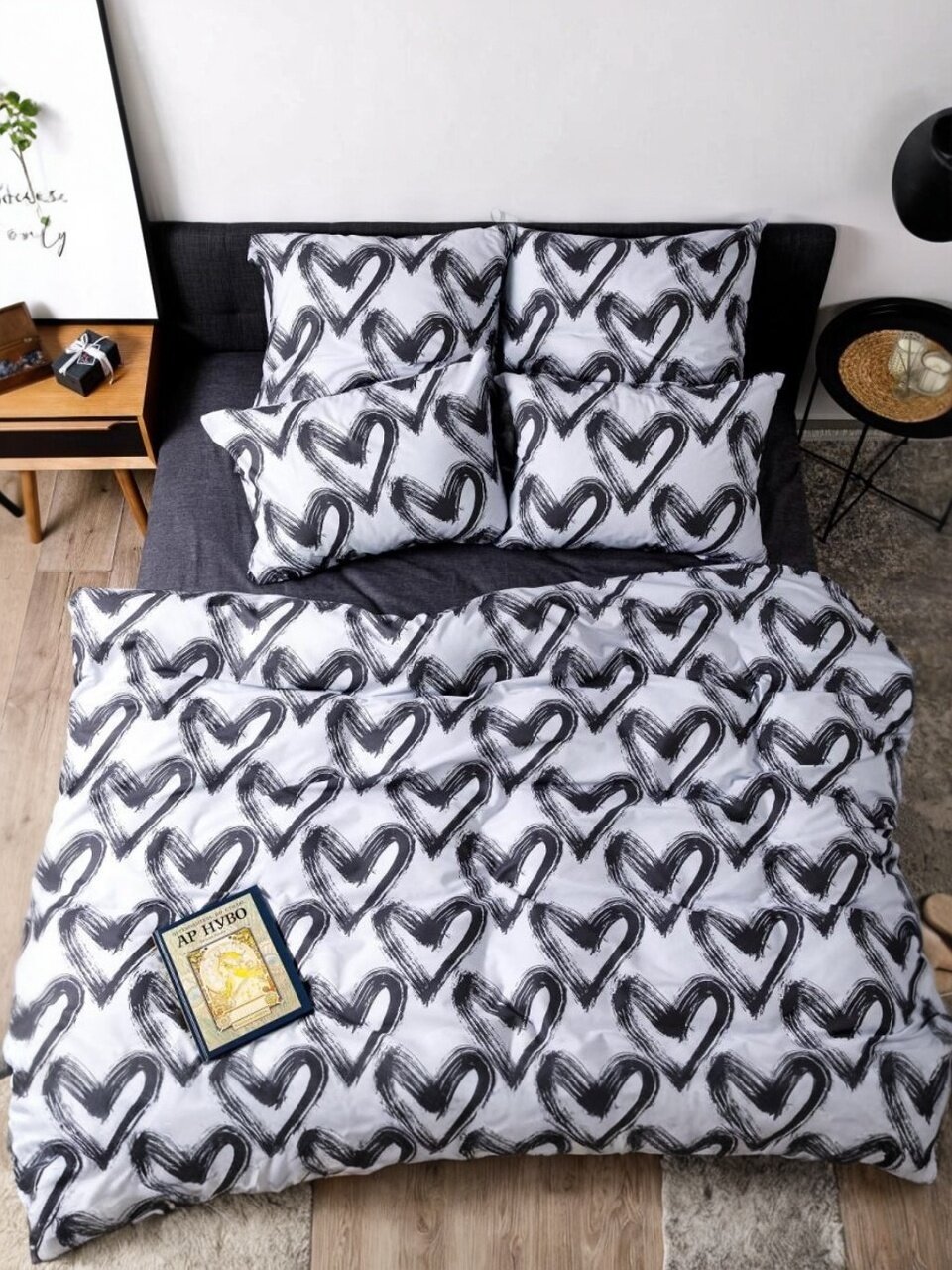 - Уникальный дизайн Dark love с модным серым оттенком и оригинальным узором-сердечками — актуальный тренд для современного интерьера спальни