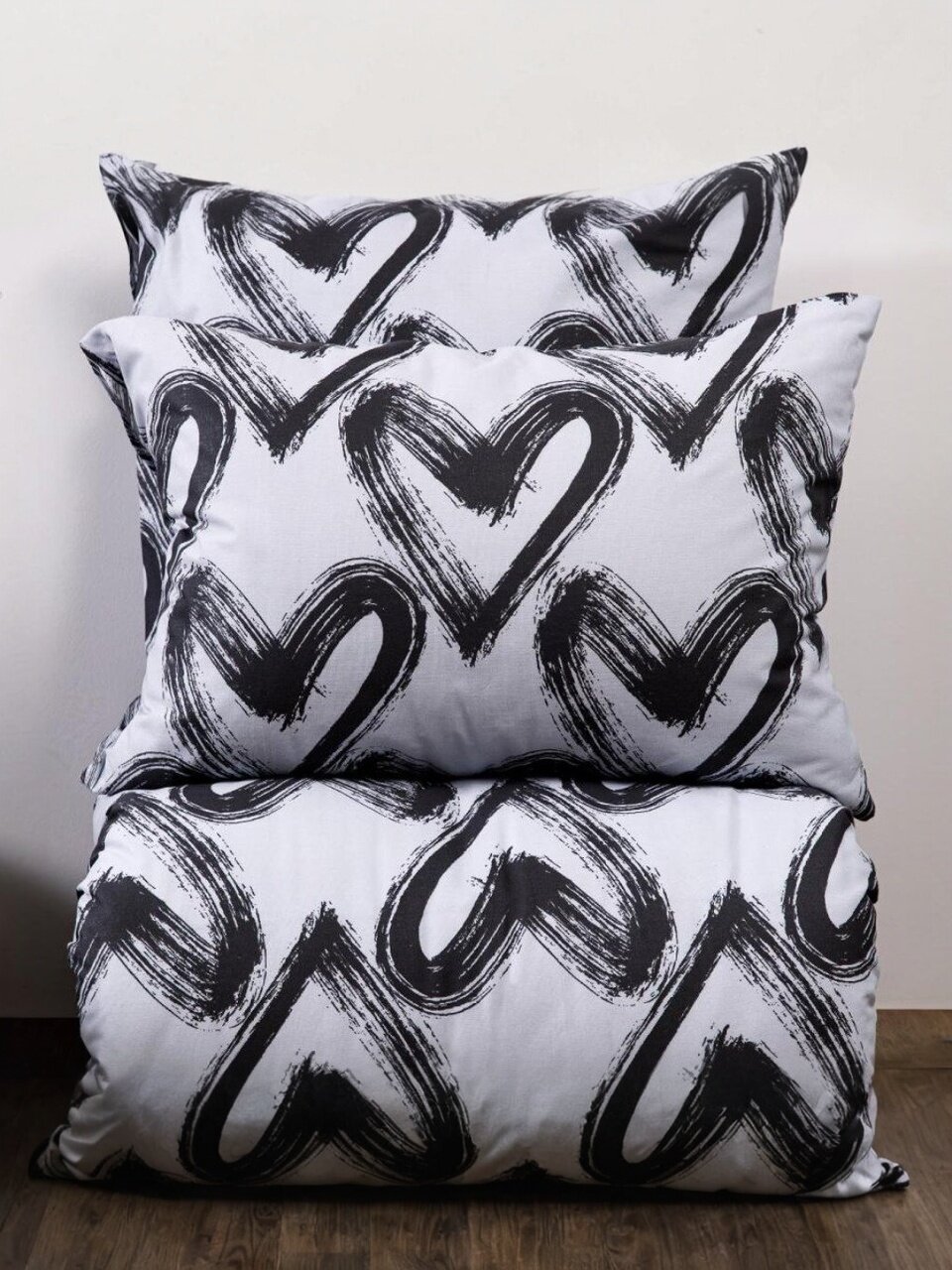 Двуспальное постельное белье «Ночь нежна» Dark love: 100% хлопок-бязь, 4 предмета, серый с сердечками — уют и стиль для вашей спальни или подарка.