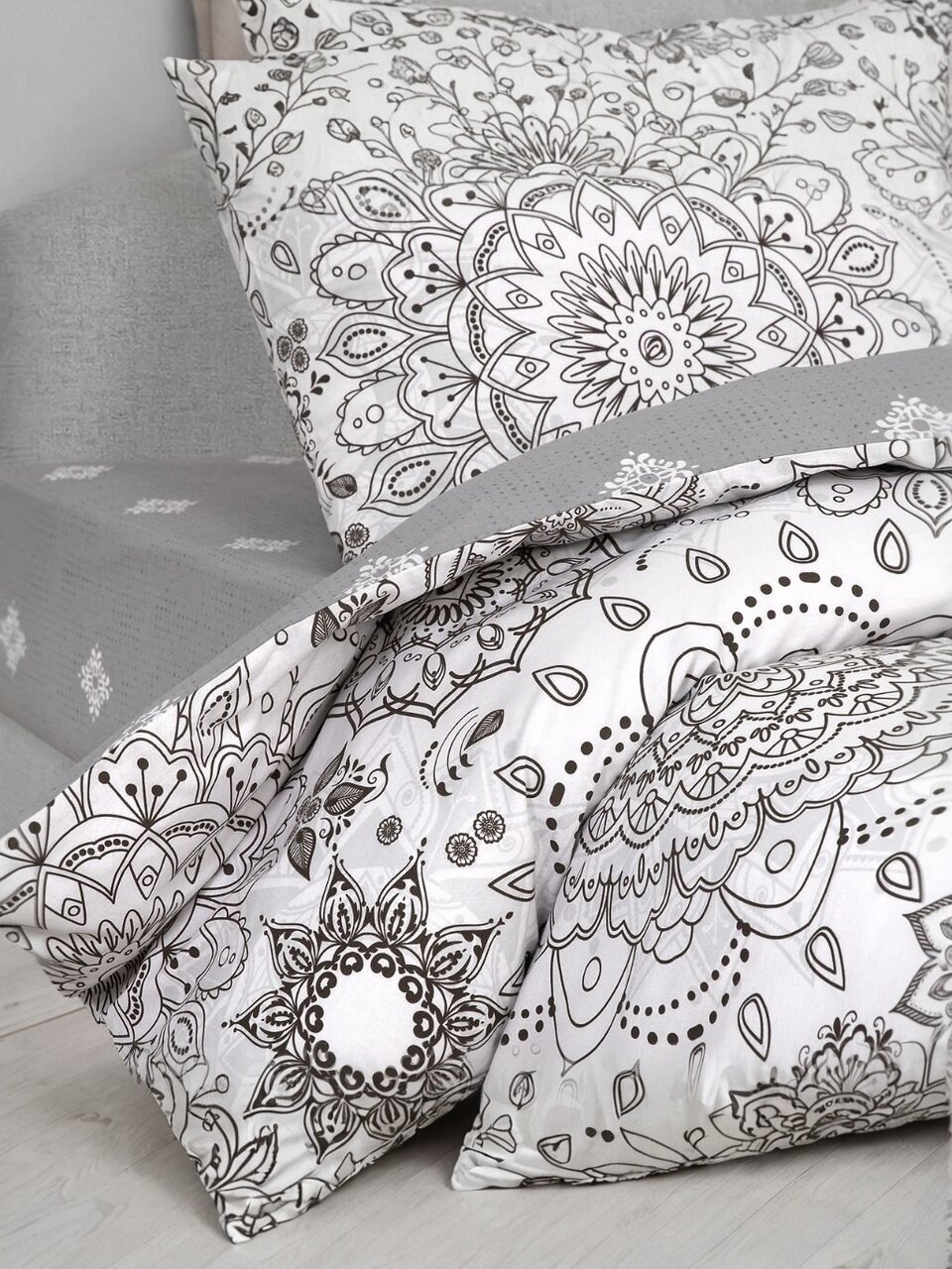 Часто спрашивают, как выбрать двуспальное постельное белье для дачи или подарка — этот комплект решает обе задачи: универсальный серый цвет, актуальный орнамент, подарочная упаковка. В отличие от классических комплектов, здесь простыня фиксируется по периметру, что облегчает уход и экономит время. Если интересует, подходит ли для аллергиков — натуральный хлопок минимизирует раздражения и подходит даже для чувствительной кожи. По сравнению с синтетическими аналогами, поплин долговечнее, не электризуется и сохраняет форму после многократных стирок.