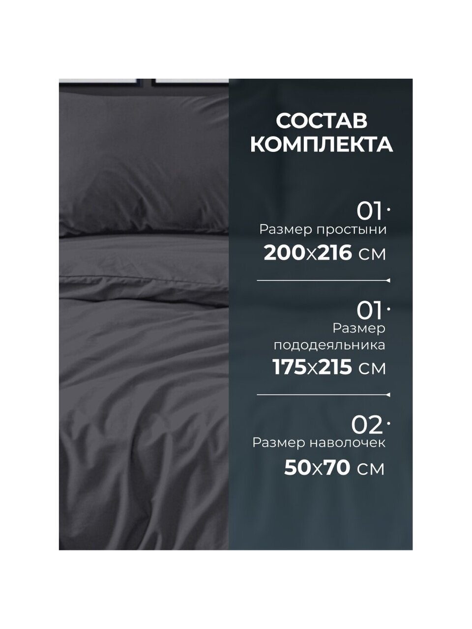 - Эргономичные размеры: простыня 200х216 см, пододеяльник 175х215 см, 2 наволочки 50х70 см