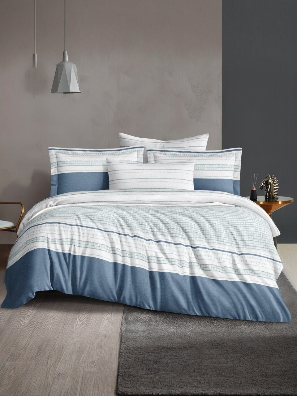 - Удобные размеры: пододеяльник 200x220 см, простыня 230x250 см, 4 наволочки (2 шт. 50x70 см, 2 шт. 70x70 см) — подходит для кроватей евро-формата.