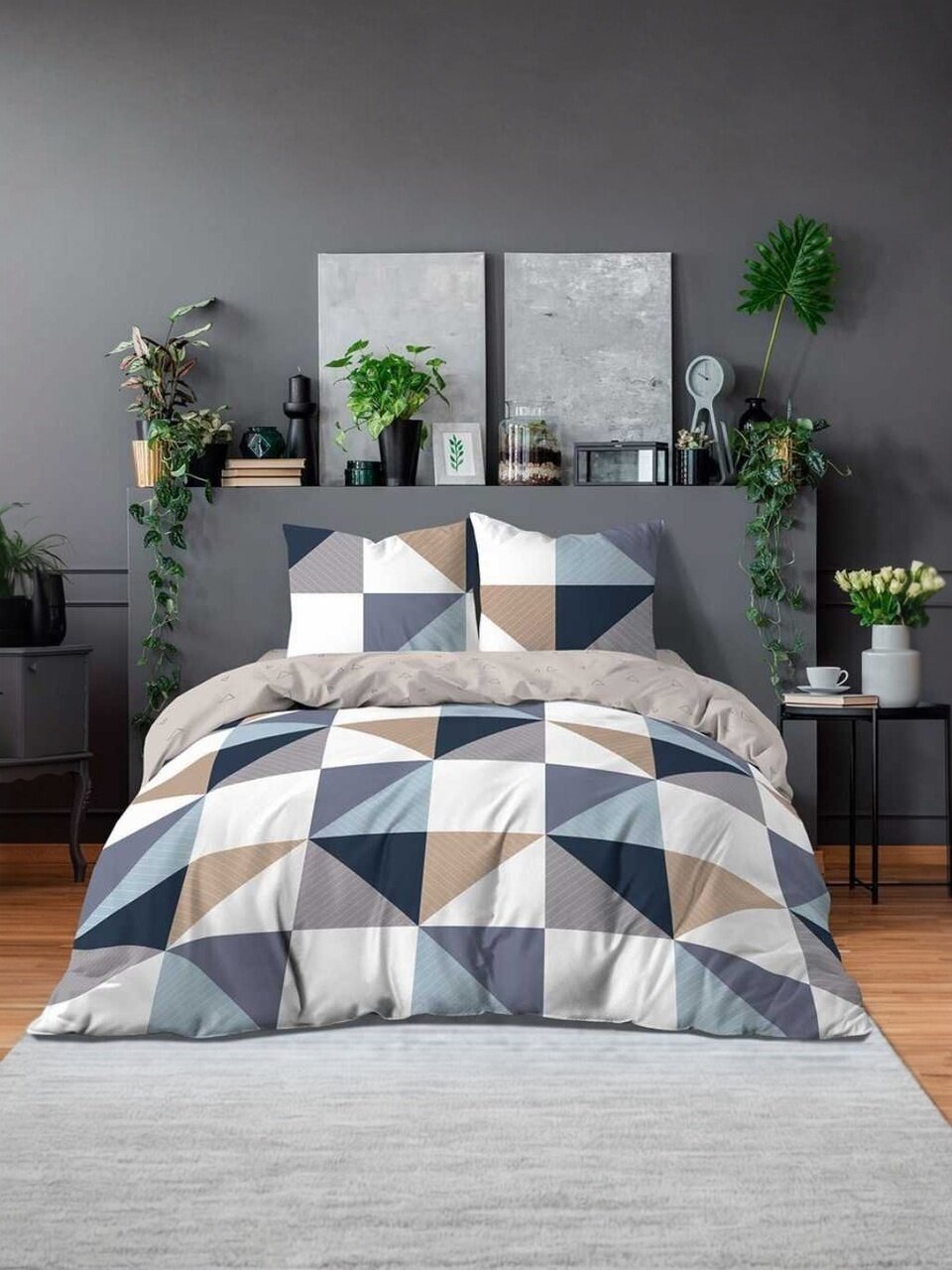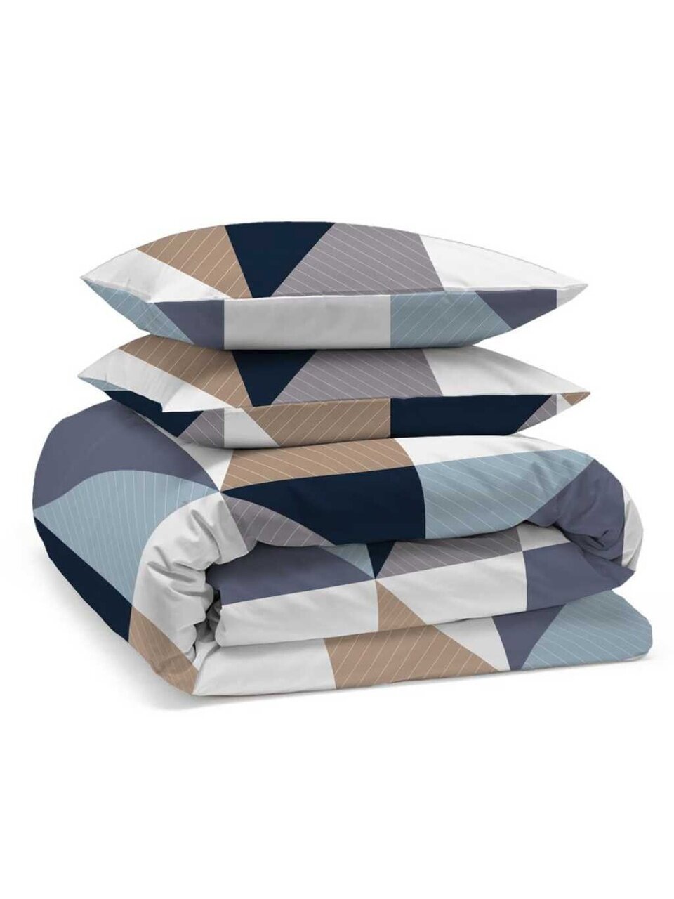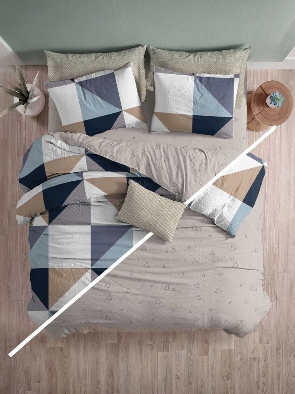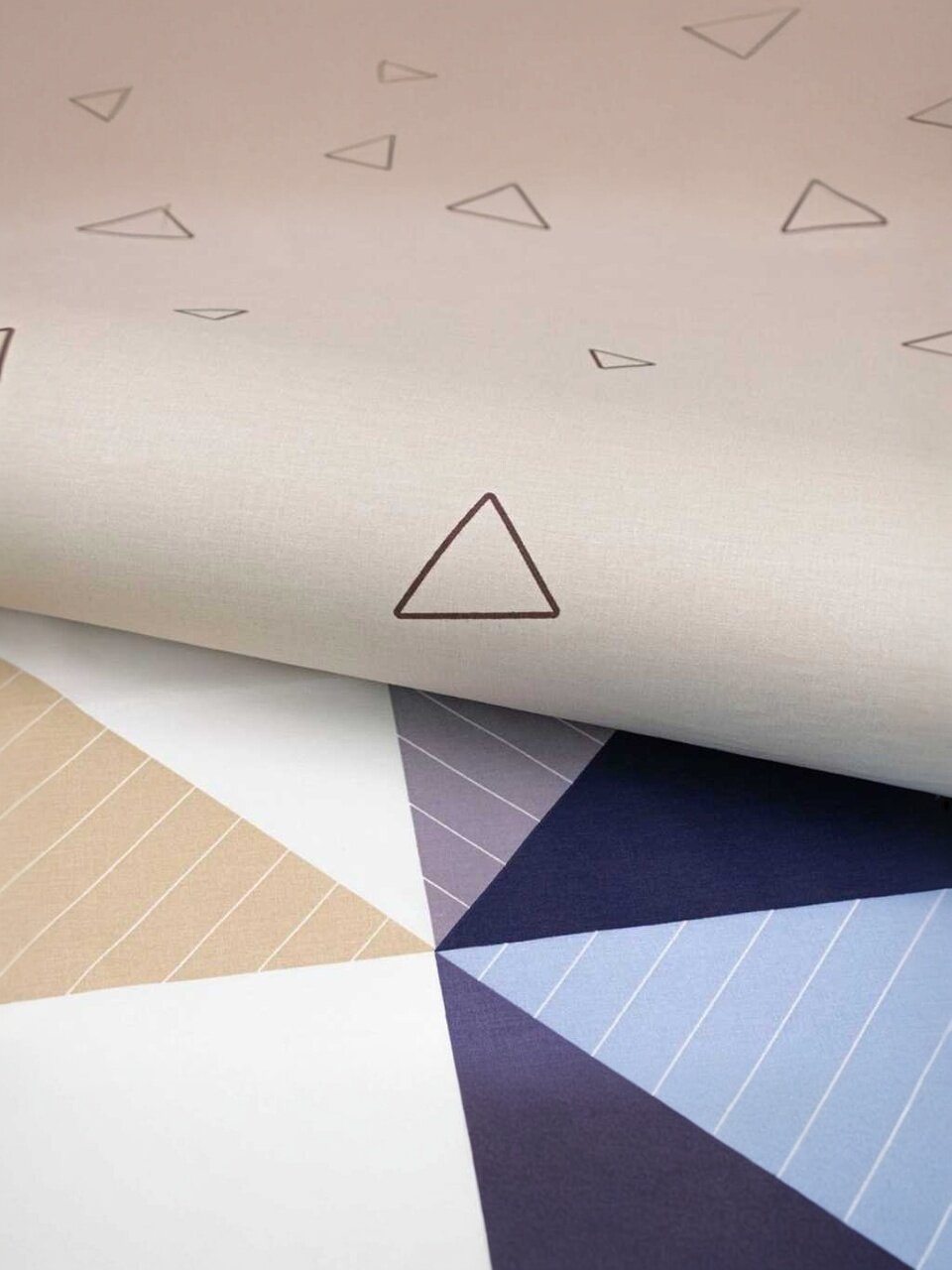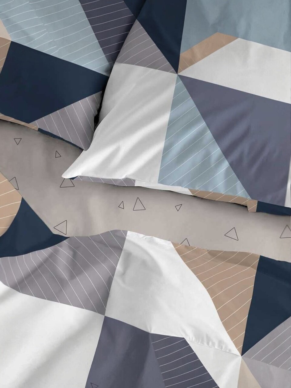 - Уникальный дизайн: геометрический принт на синем поплине — современное решение для спальни.