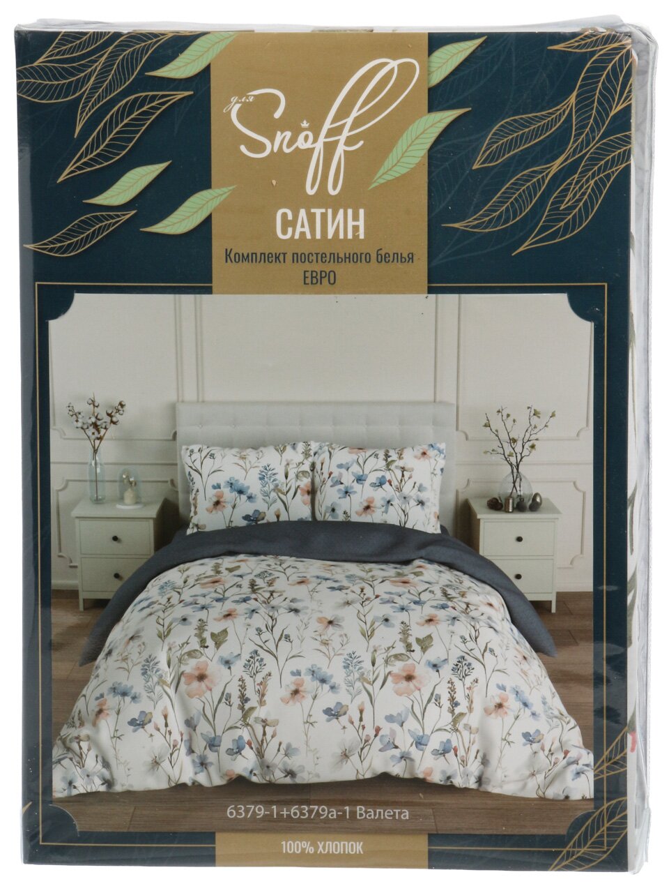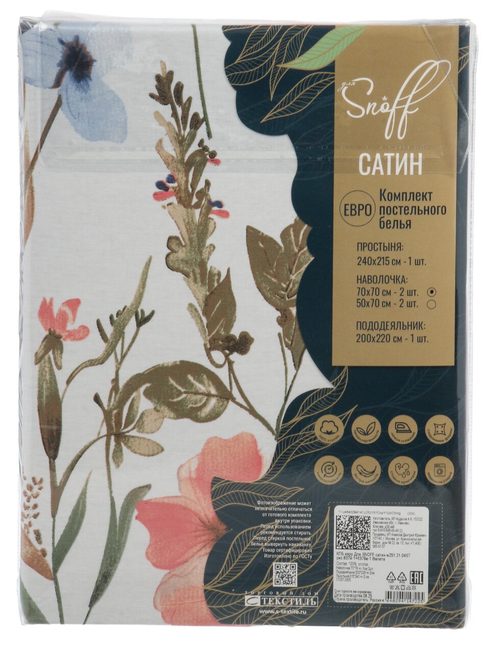 Постельное белье евро «Валета» из сатина (100% хлопок), 4 предмета, для Snoff — стильный белый комплект с цветочным дизайном для комфортного сна и подарка.