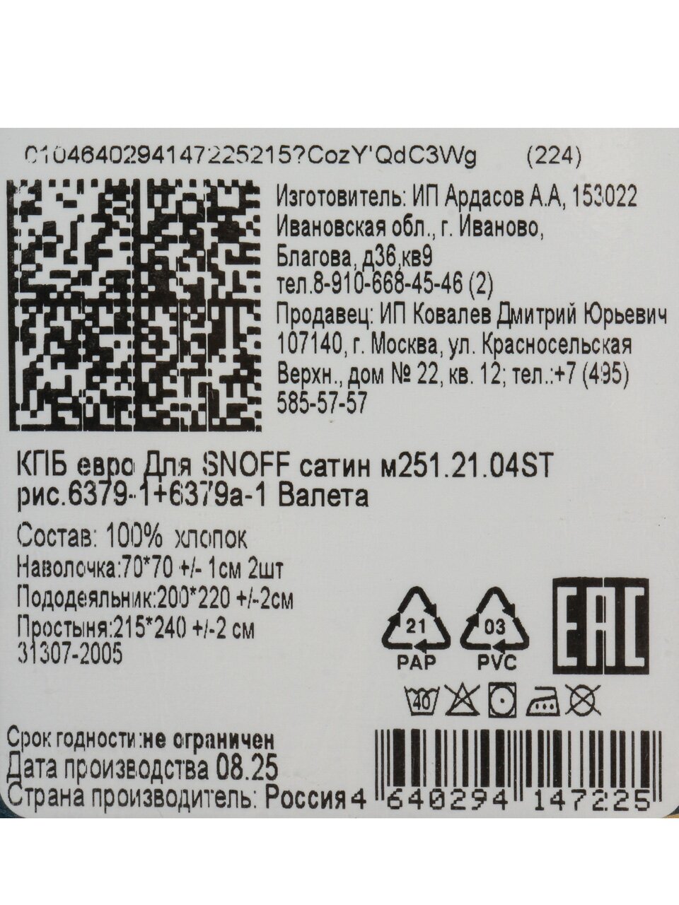 Вы можете приобрести «Постельное белье евро, простыня 215х240 см, 2 наволочки 70х70 см, пододеяльник 200х220 см, Для Snoff, сатин, Валета» и другие товары в нашем интернет-магазине в Липецке по низким ценам и с бесплатным самовывозом.