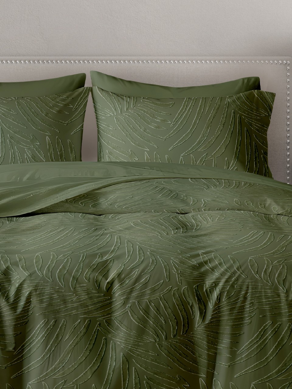 Двуспальное постельное белье ART for Home «Листья 18-0316» из полисатина: комфортный сон, стильный зеленый жаккард, оптимальный комплект для дома и дачи.