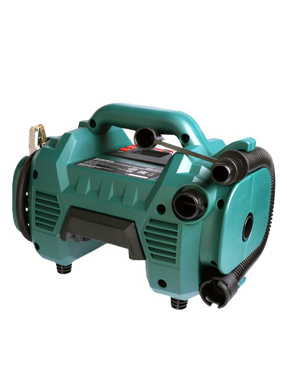 - Производительность: 20 литров в минуту при давлении до 10 бар — оптимально для автошин, велосипедов, мячей