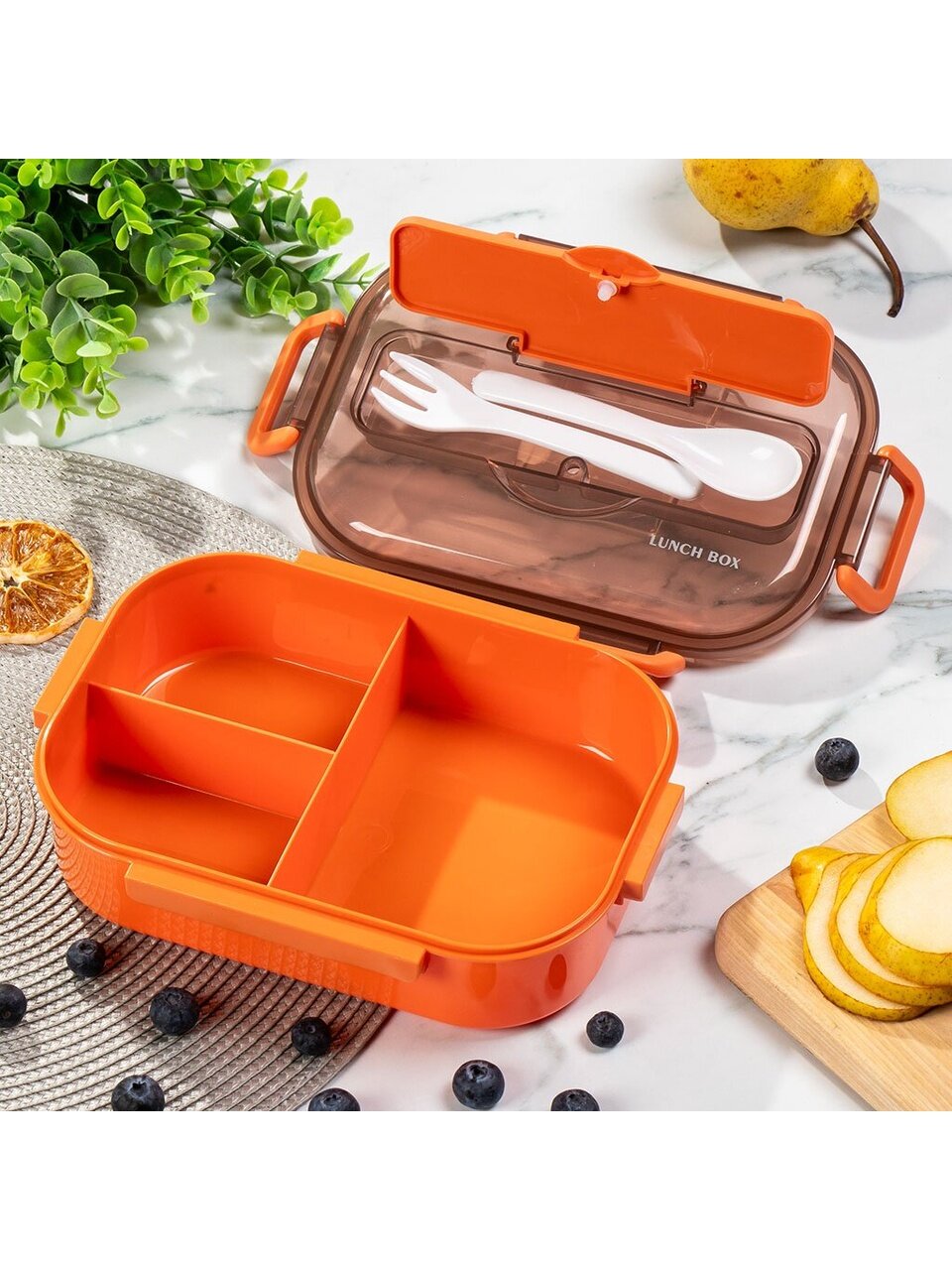 Пищевой контейнер из пластика 22.5х16.5х6.5 см с ложкой и ручками: удобно брать обед с собой, подходит для СВЧ и посудомоечной машины