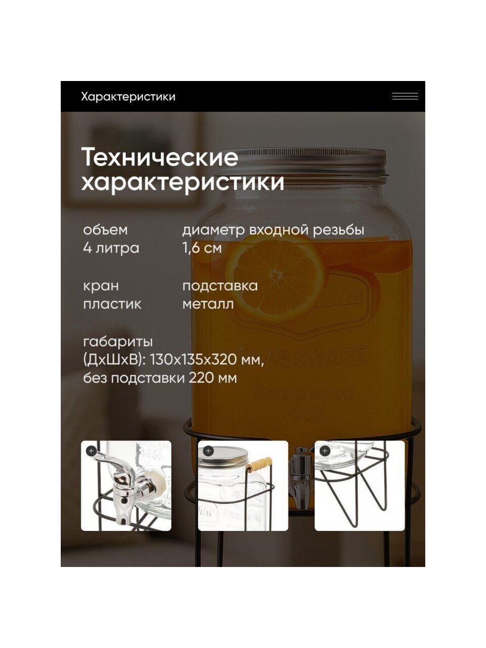 Изящный стеклянный диспенсер для напитков превратит Вашу сервировку в настоящее произведение искусства. Оптимальный объем 4 литра позволит подать к столу достаточное количество сока или лимонада даже для большой компании.