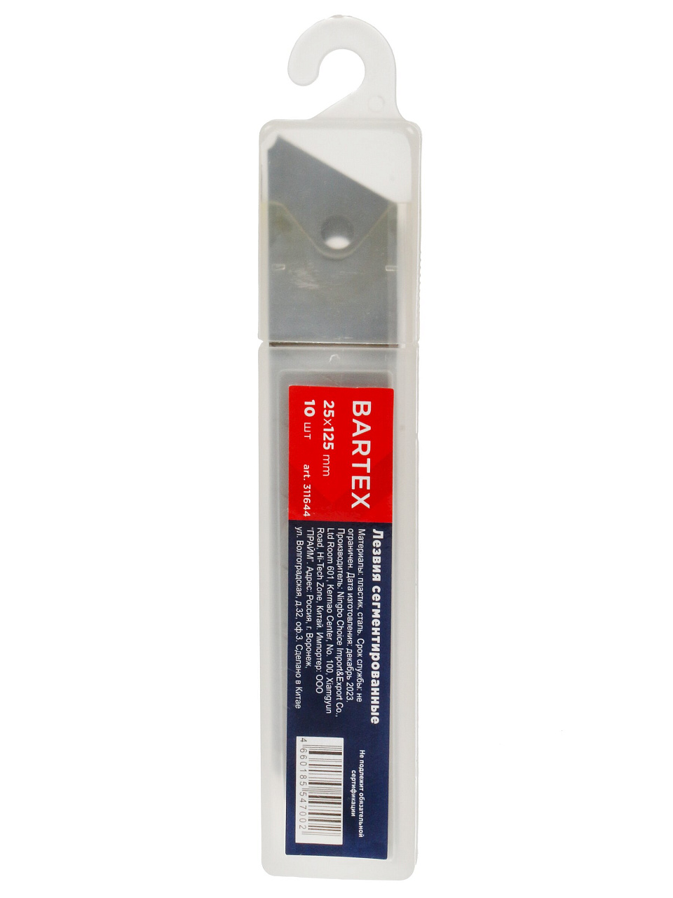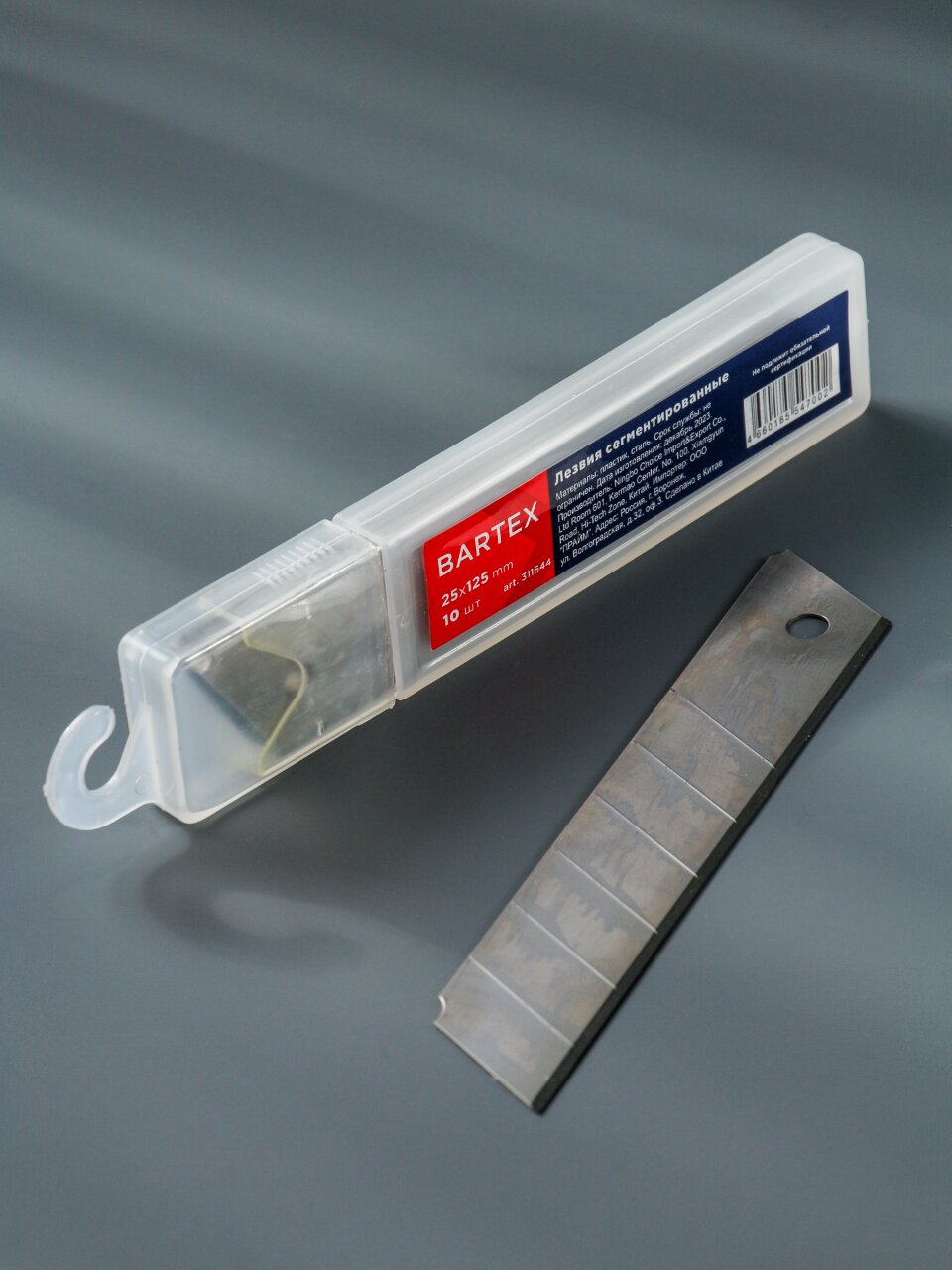 Сегментированное лезвие Bartex UK-82-25 является сменным элементом для пистолетного ножа. Применяется для реза тонких неплотных материалов: линолеума, картона, бумаги, пластика, кожи, резины и т.д. Сегментированная конструкция удобна тем, что в необходимый момент можно обломить затупившийся сегмент лезвия и продолжить работу новой режущей кромкой. Это очень удобно и помогает сэкономить время, не отвлекаясь на заточку ножа. Количество — 10 штук. Толщина лезвия 0.7 мм.