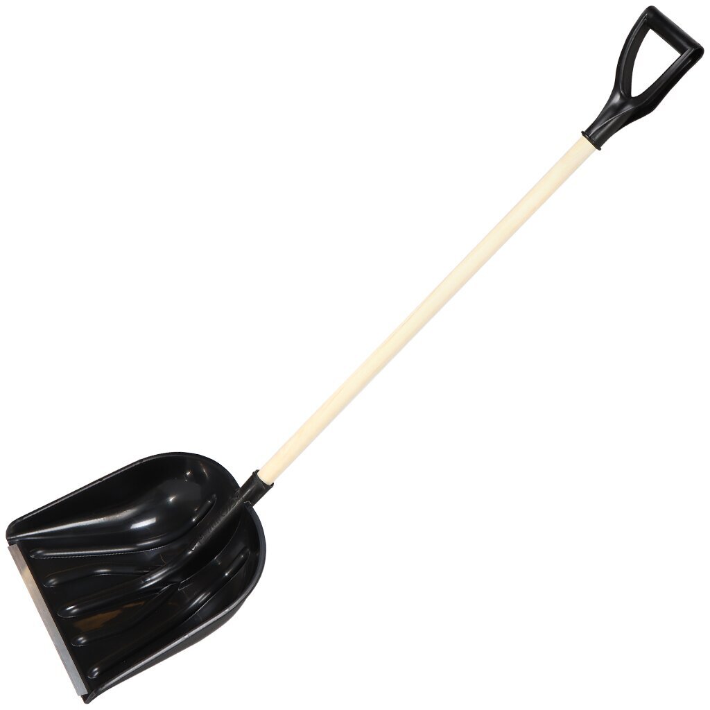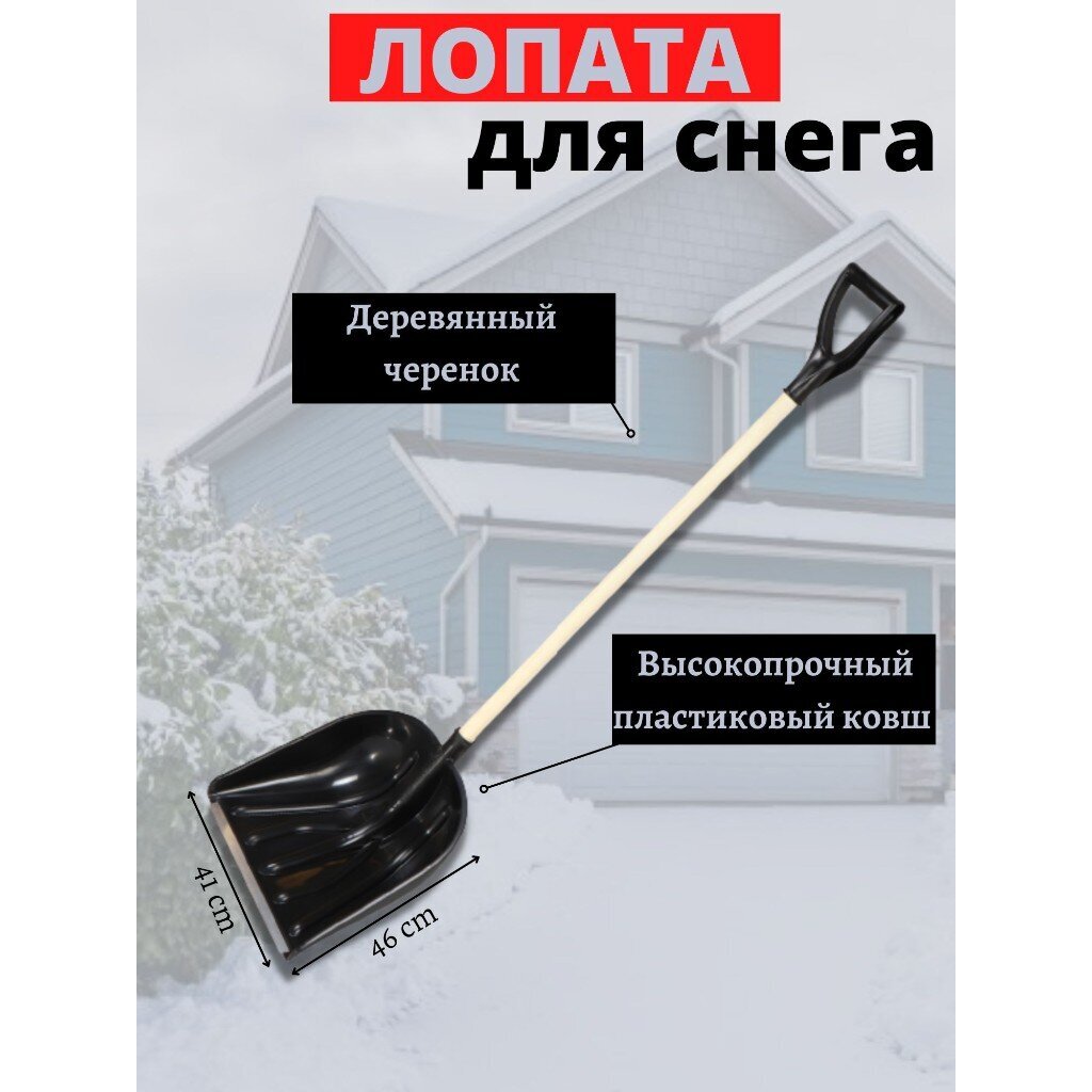 Лопата для снега пластик 410х460 мм с деревянным черенком и V-ручкой — быстрое решение для уборки снега на даче и возле дома, прочная и удобная для любого возраста.