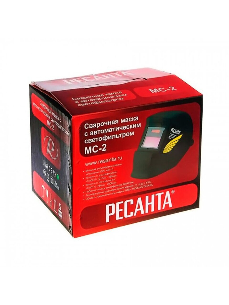 Сварочная маска РЕСАНТА МС-2 предназначена для защиты глаз от видимого, ультрафиолетового и инфракрасного излучения, а также для защиты головы и шеи от попадания искр при сварочных работах. Маска данного типа удобна, поскольку светофильтр автоматически затемняется при зажигании дуги. Такой светофильтр назвали «хамелеоном» из-за способности автоматически затемняться. Степень затемнения можно настраивать с помощью встроенного регулятора в зависимости от модели маски.