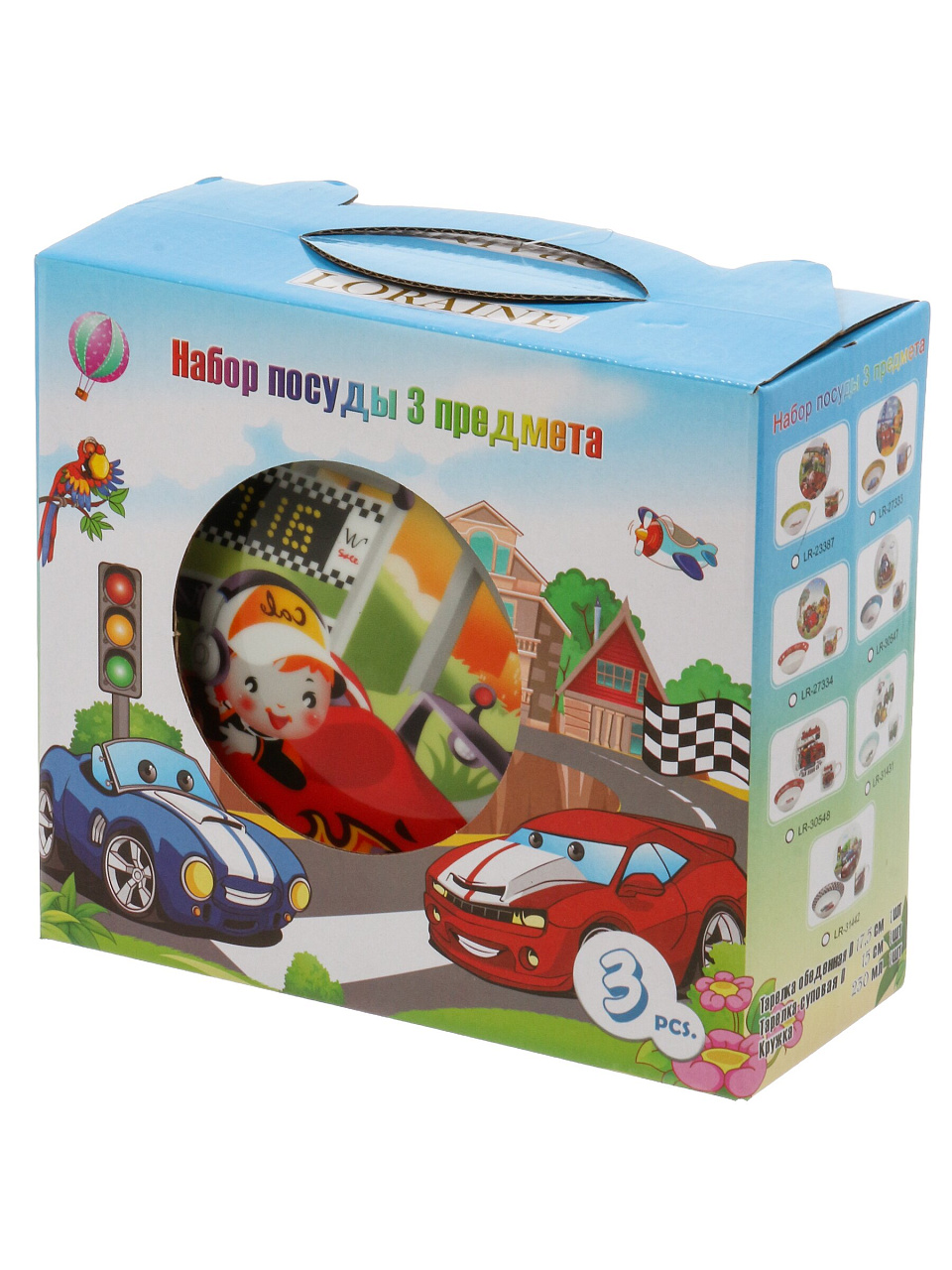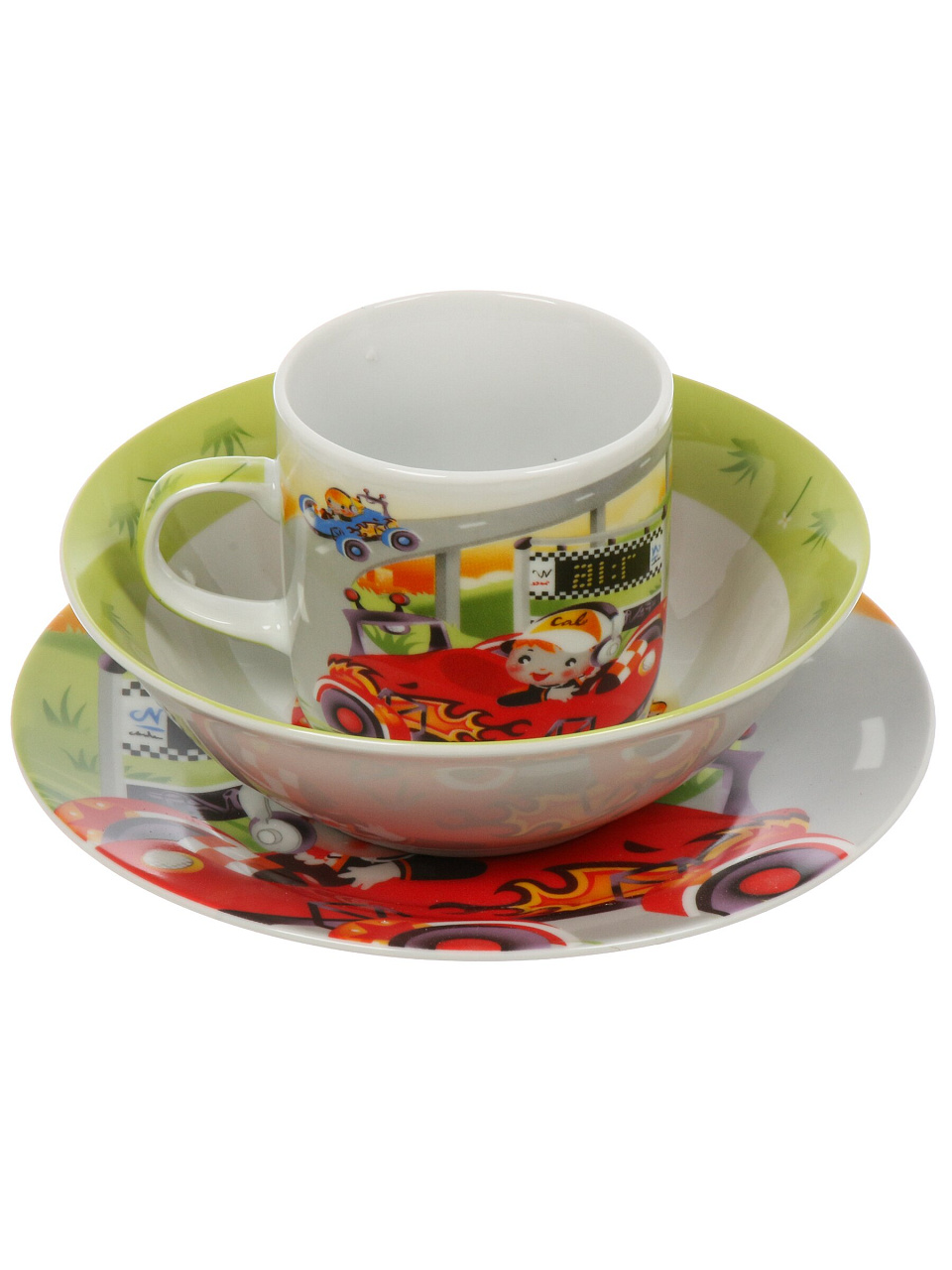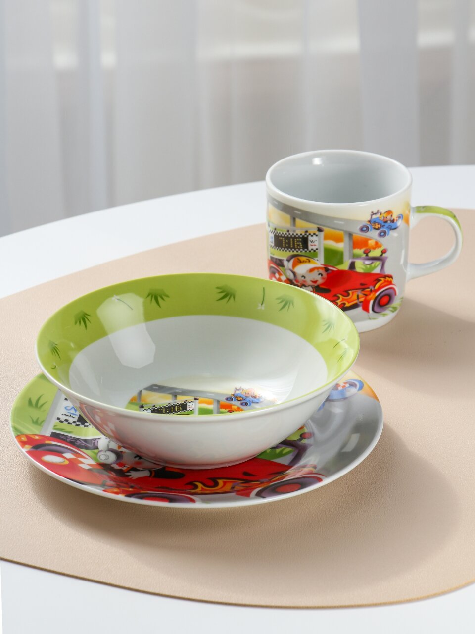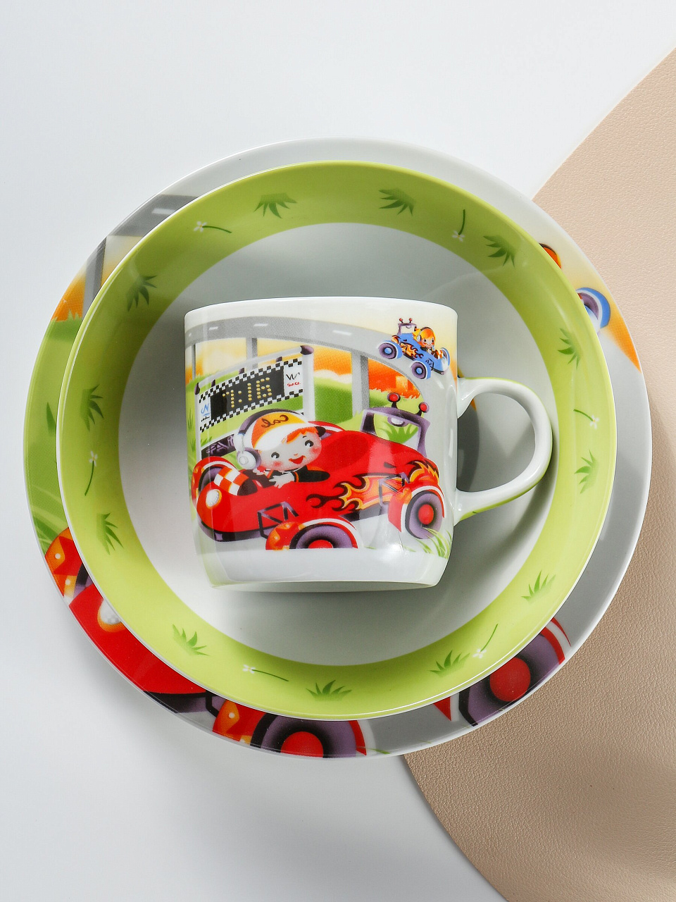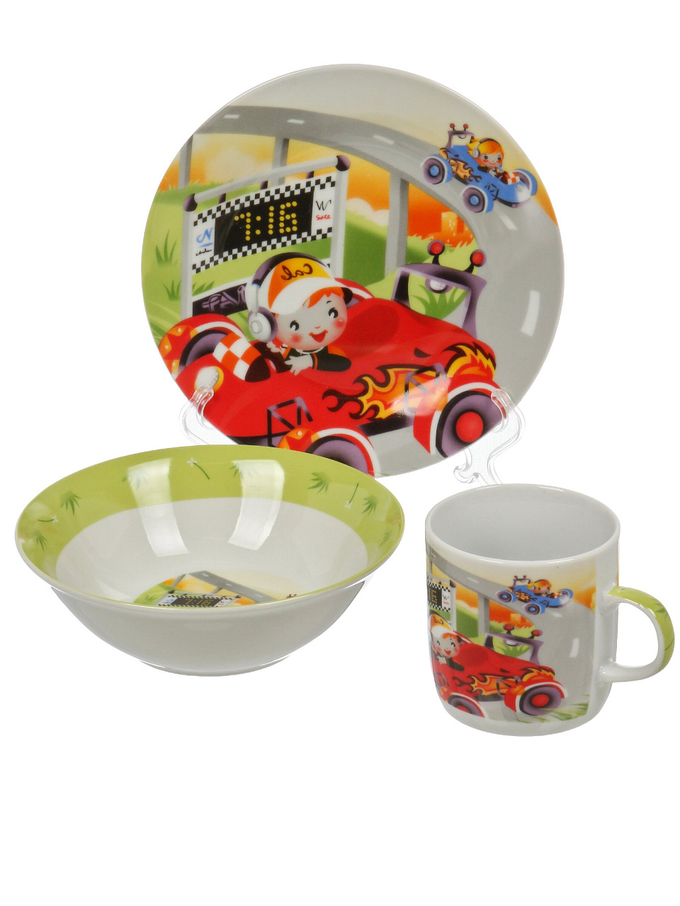 Набор детской посуды из фарфора Loraine «Гонки», 3 предмета: идеальный подарок для мальчика, безопасно и удобно для ежедневного использования дома и на даче.