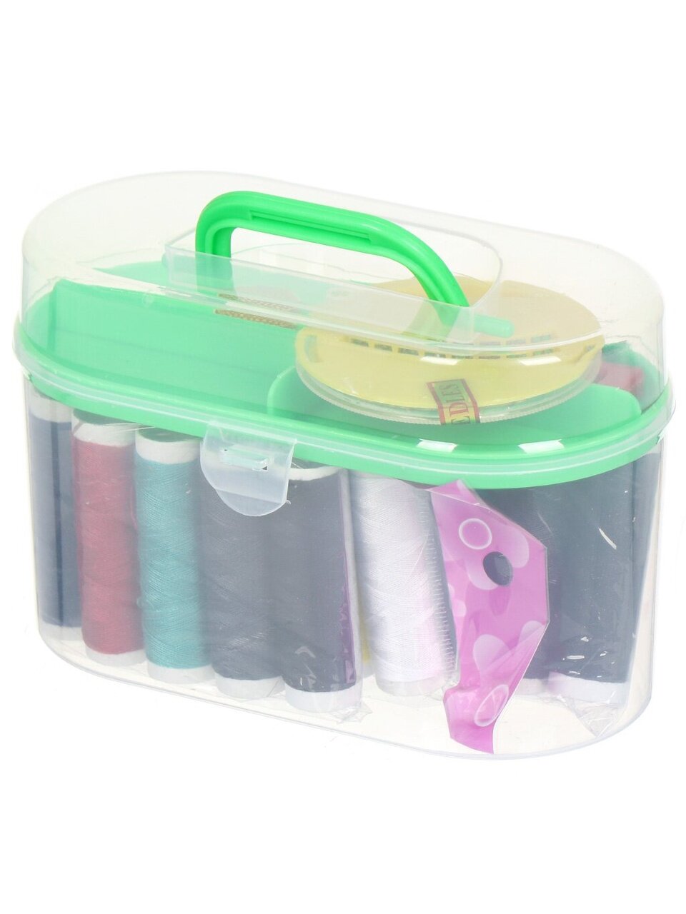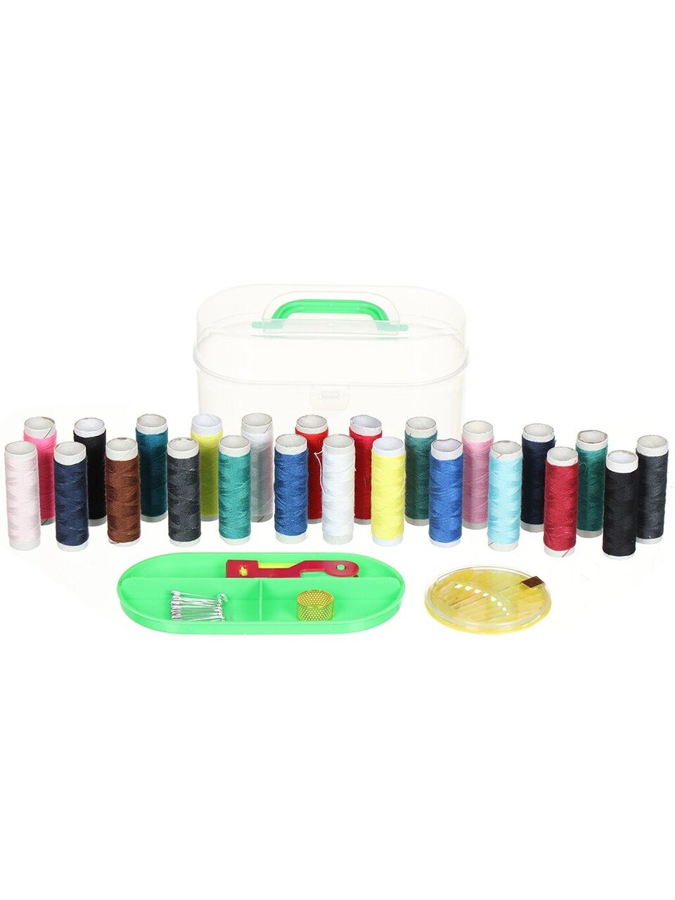 Набор для шитья имеет большое наполнение для подобных наборов, имеет широкий выбор ниток, иголок, набор булавок, наперсток и другие аксессуары. Упакован в компактный кейс из прочной полиэстера.