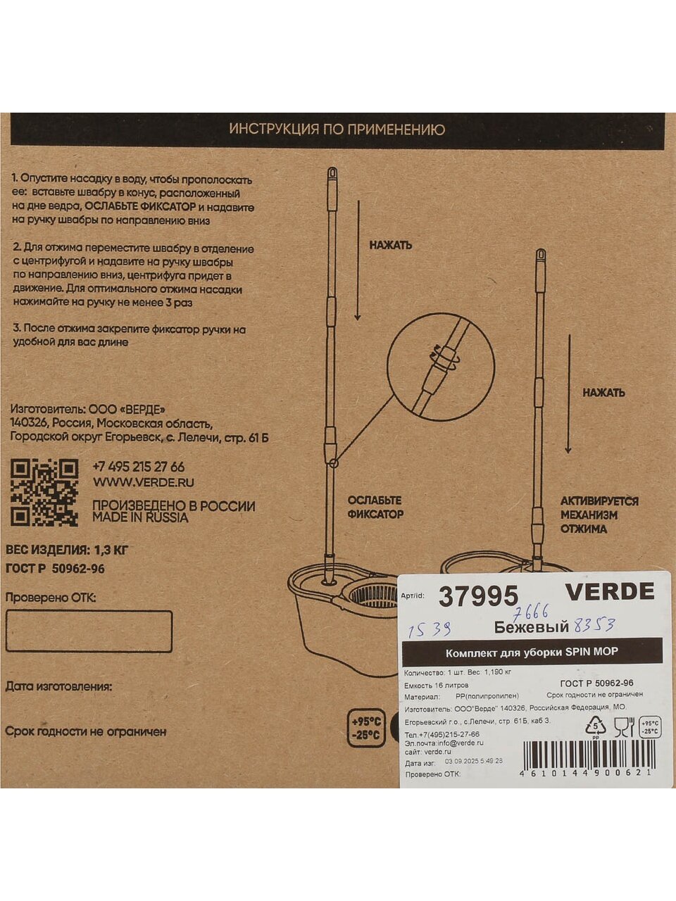 Вы можете приобрести «Набор для уборки ведро с отжимом, швабра МОП, бежевый, Verde, Spin Mop, 37995» и другие товары в нашем интернет-магазине в Борисоглебске по низким ценам и с бесплатным самовывозом.