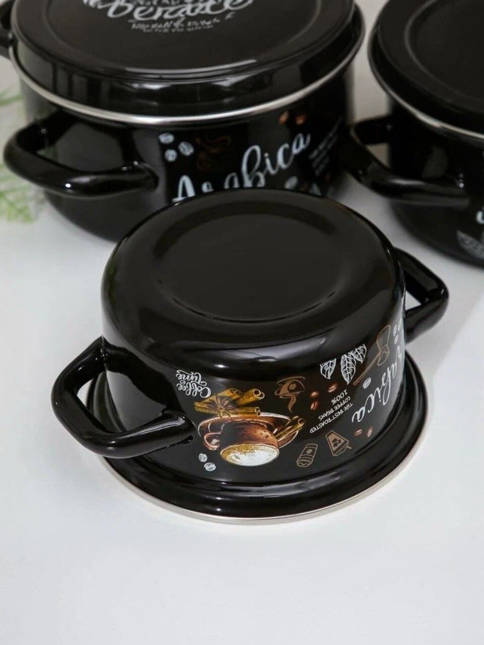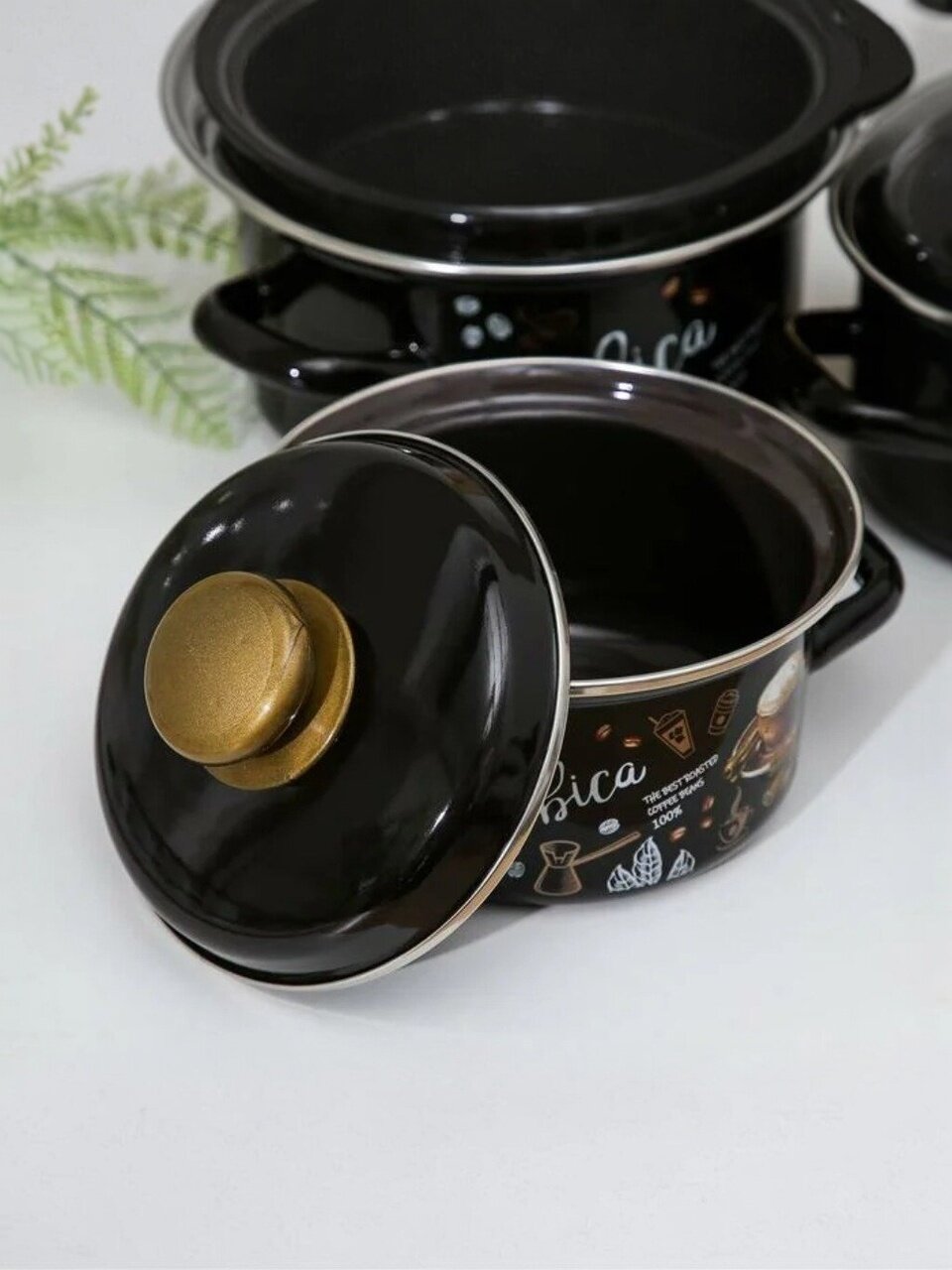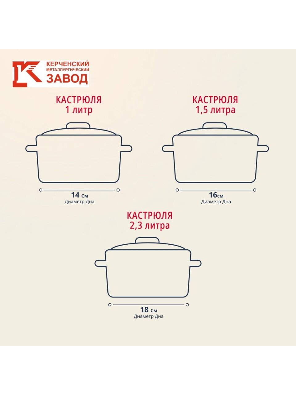 - Три размера кастрюль (1, 1.5, 2.3 л): оптимально для приготовления порций на семью, материал — эмалированная сталь без антипригарного покрытия