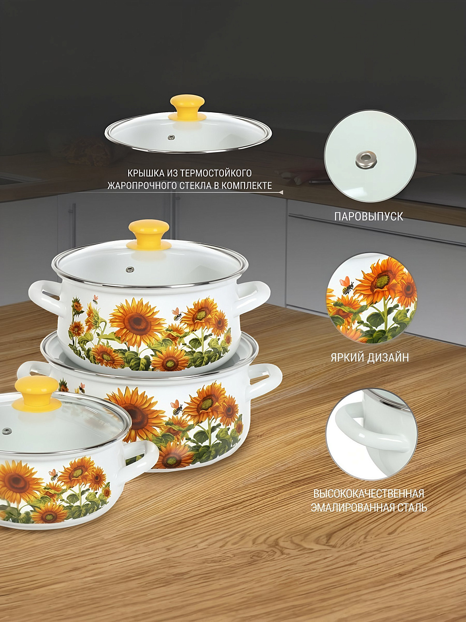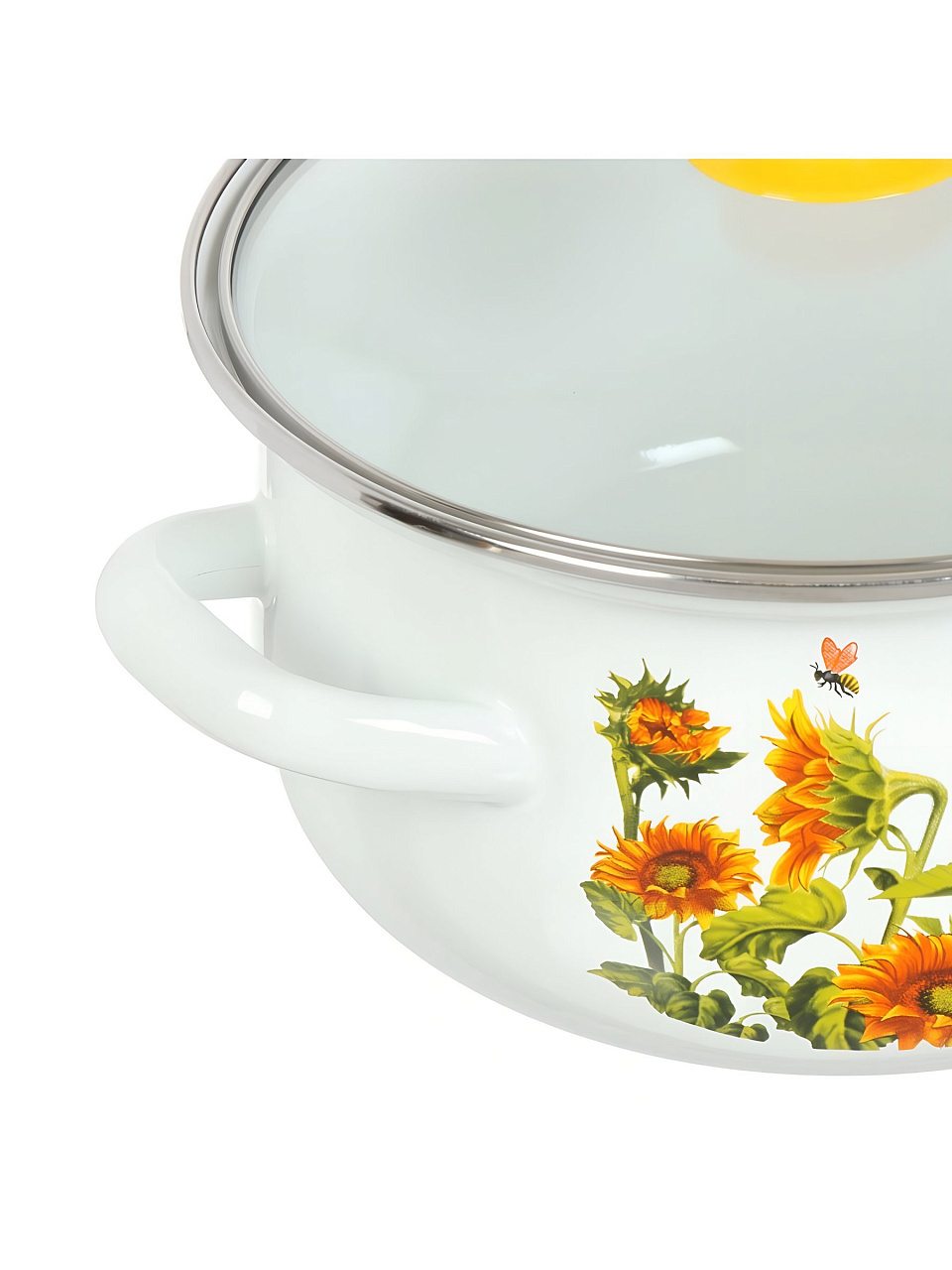 - Объемы 2, 3 и 4 литра, прочная эмаль, стеклянные крышки — подходят для газовых, электрических и стеклокерамических плит.