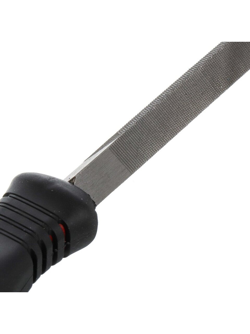 Трехгранный напильник используется при слесарных работах и мелком ремонте для опиливания и подгонки металлических деталей, зачистке клемм, обработке небольших отверстий или мелких пазов. Он имеет треугольное сечение, что обеспечивает удобство работы в труднодоступных местах. Пластиковая рукоятка обеспечивает комфорт при удержании инструмента и предотвращает скольжение в руке. Трехгранный напильник является необходимым инструментом в наборе домашнего мастера или профессионального слесаря.