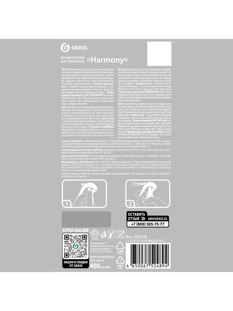 Освежитель воздуха Grass Harmony Луговые цветы 400 мл — быстрое устранение неприятных запахов и лёгкий аромат свежести для вашего дома или офиса.