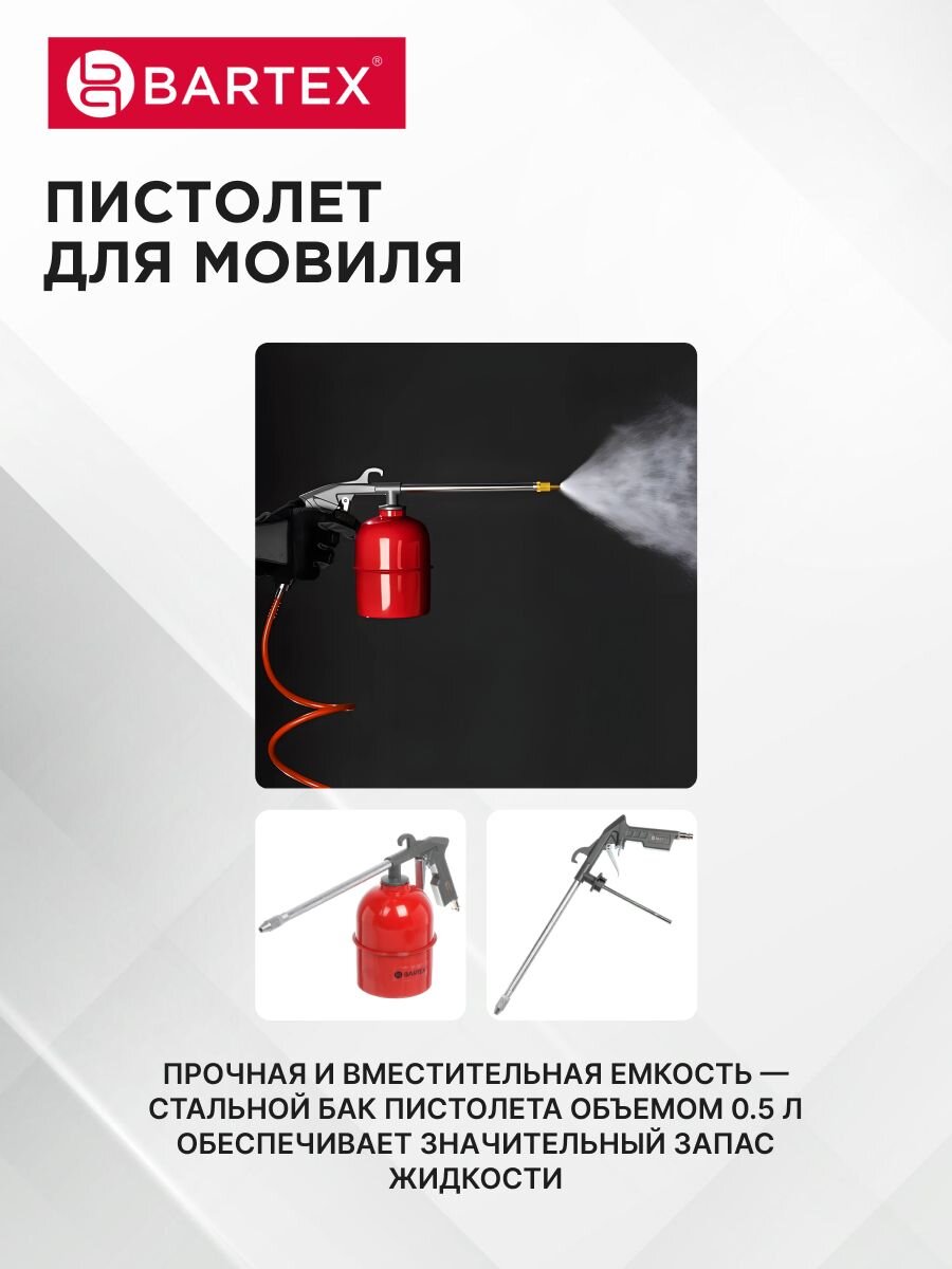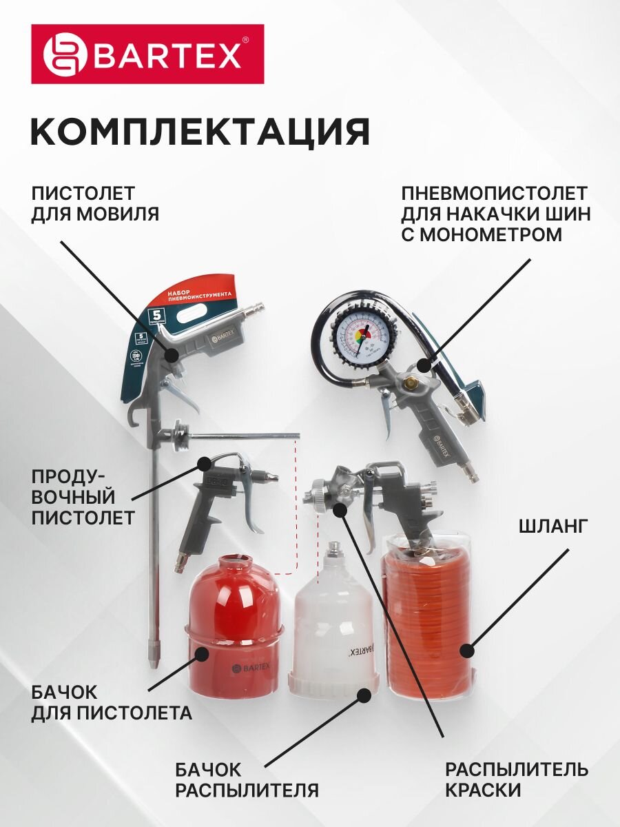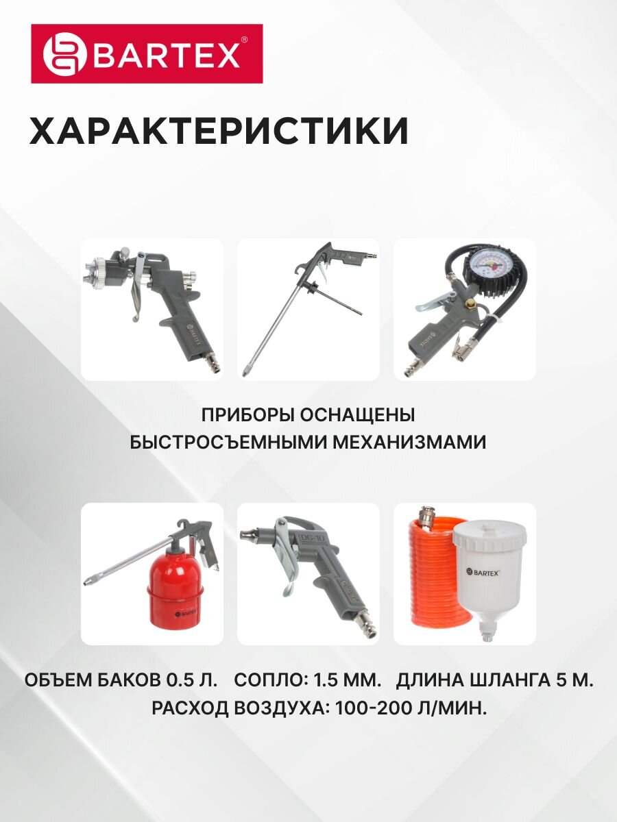 Набор Bartex – это отличный комплект, в котором есть все необходимое для работы с пневматикой. Он значительно сократит время ремонтных работ и улучшит их качество. С его помощью Вы без труда нанесете ровное лакокрасочное покрытие, подкачаете шины или избавитесь от нежелательного мусора в труднодоступных местах. Это не только нужный в каждом доме инструмент, но и отличная идея для подарка.
