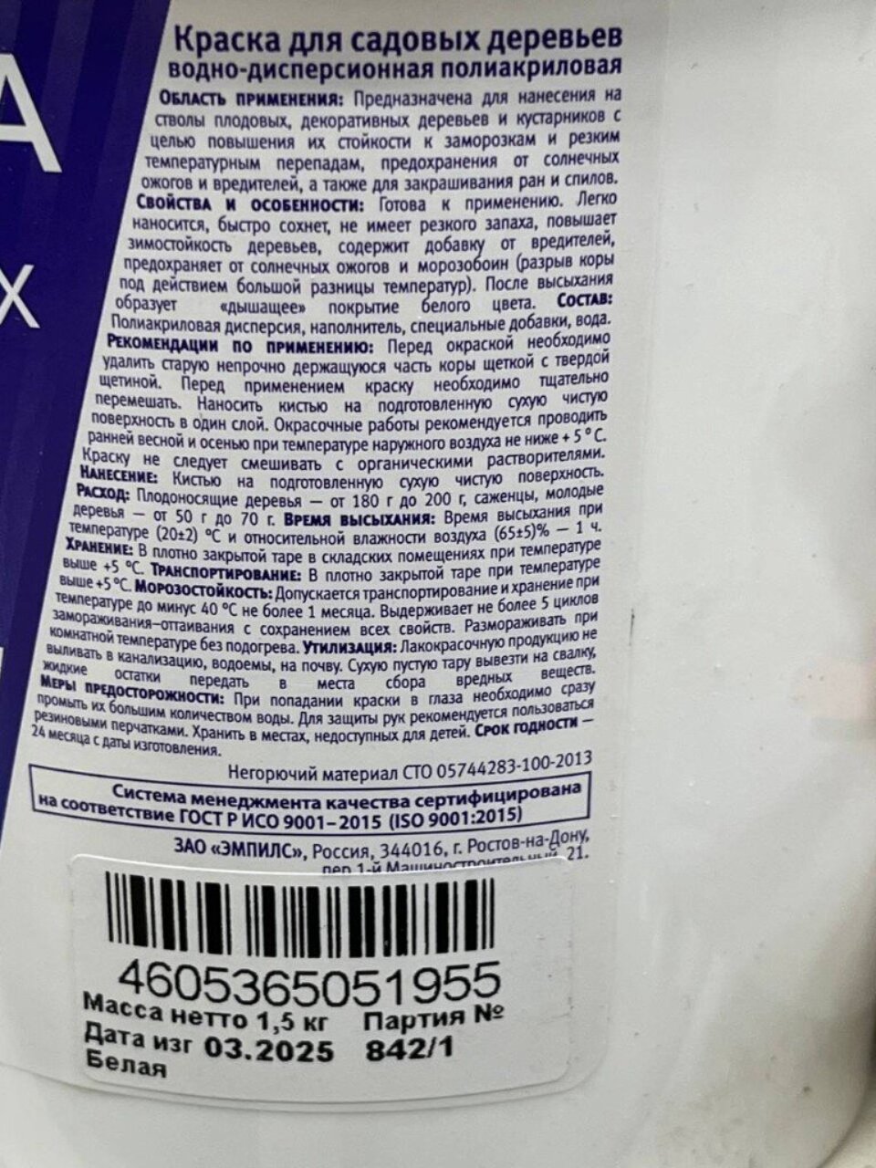 Предназначена для нанесения на стволы плодовых, декоративных деревьев и кустарников с целью повышения их устойчивости к заморозкам и резким температурным перепадам, предохранения от солнечных ожогов и вредителей, а также для закрашивания ран и спилов.
