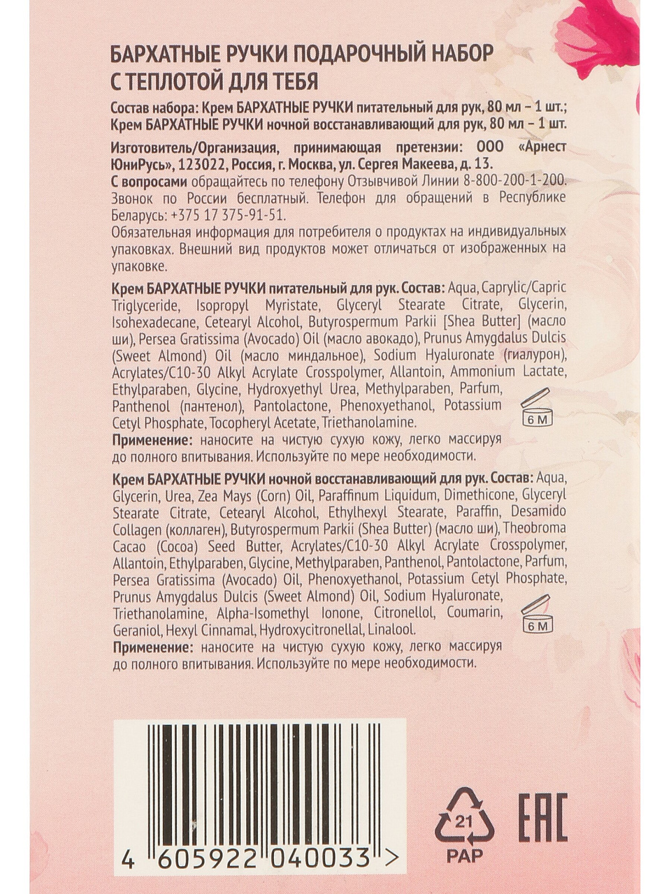 Набор «Бархатные ручки Обновление» — это экспертное решение для комплексного ухода за кожей рук. Питательный крем быстро впитывается, не оставляет жирной плёнки и защищает от агрессивного воздействия воды и моющих средств. Ночной крем работает во время сна, глубоко восстанавливает и смягчает кожу, что особенно важно при частом мытье рук или в отопительный сезон.