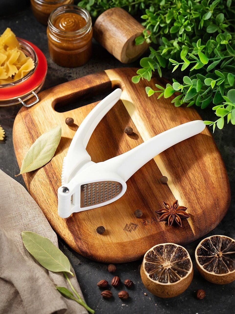 - Удобная конструкция пресса позволяет легко извлекать выжатый чеснок и остатки.