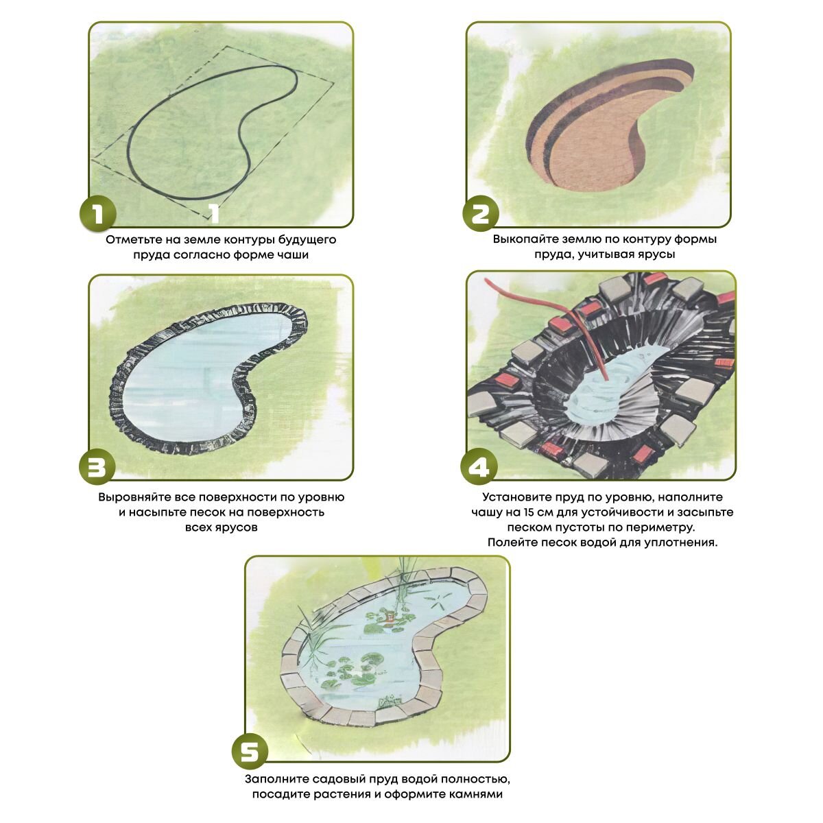 Пластиковый материал не подвержен коррозии, не требует сложного обслуживания и легко очищается. Компактные размеры — длина 145 см, ширина 110 см, глубина 50 см — позволяют разместить пруд даже на небольшом участке, при этом он выглядит солидно и привлекательно. Средний размер идеально подходит для большинства приусадебных территорий, а также для оформления зоны отдыха рядом с домом или беседкой.