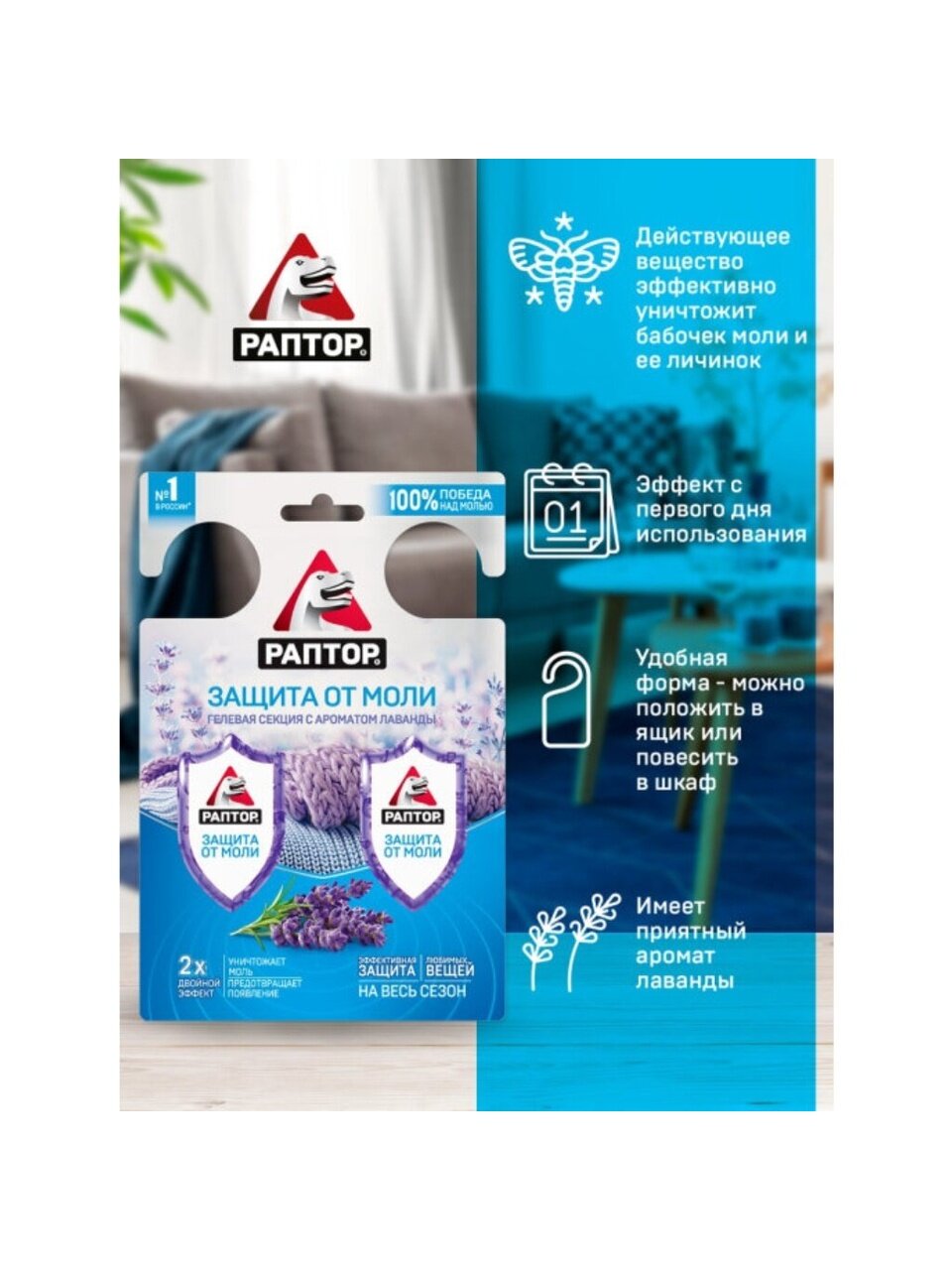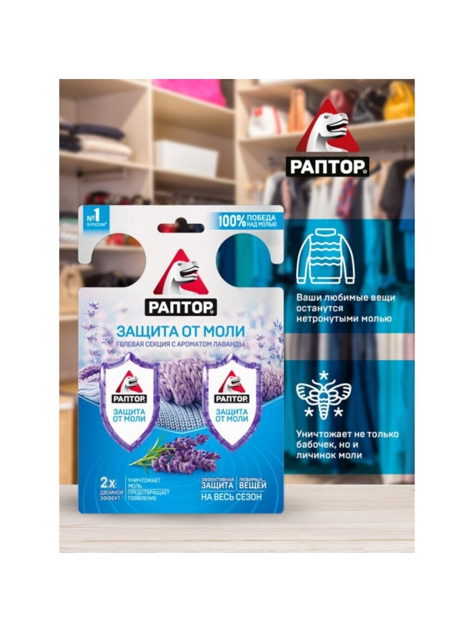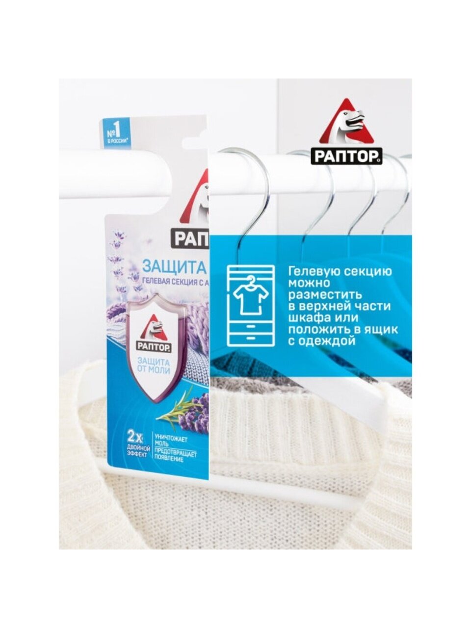 Репеллент от моли в виде гелевой секции с ароматом лаванды — эффективное средство для защиты вещей в доме. Продукт Раптор "Двойной эффект" быстро уничтожает моль, устраняет неприятные запахи и придаёт свежесть. Удобная форма секции позволяет просто разместить средство в шкафу или комнате. Идеально подходит для помещений, где требуется максимальная защита от моли без вреда для одежды.
