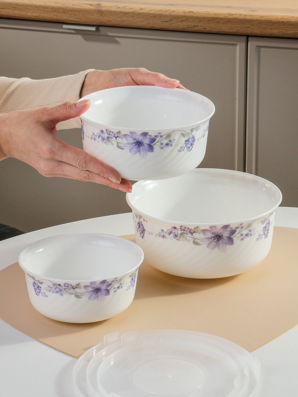 Салатники Daniks «Элегия» — набор из 3 круглых стеклокерамических мисок с крышками (0,5/0,8/1,4 л), белый цвет, стиль прованс. Идеальное решение для сервировки и хранения.