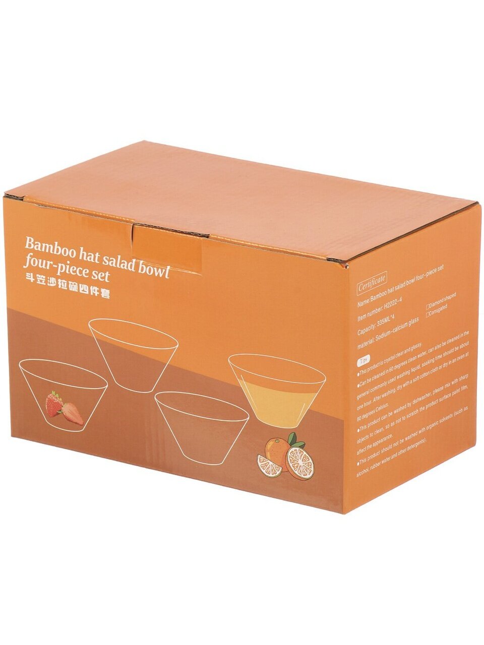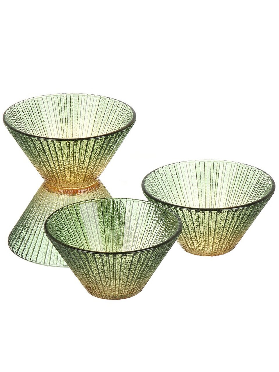 Каждый салатник имеет объем 0.4 л, диаметр 12 см и высоту 7.5 см. В наборе 4 круглых салатника из цветного стекла.