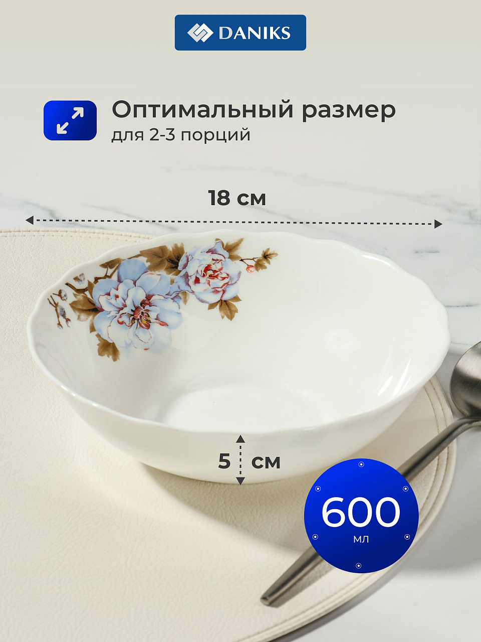 Объем 0.6 литра (600 мл), диаметр 18 см, высота 5 см. Подходит для подачи салата на 2–3 человек или для индивидуальных порций гарниров и фруктов.