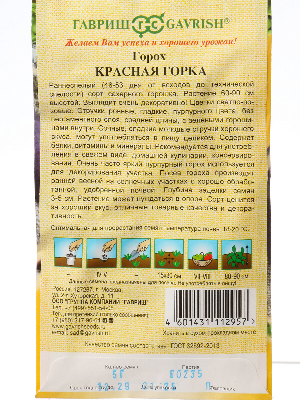 Семена Горох, Красная горка, 5 г, Семена от автора, овощные, цветная упаковка, Гавриш